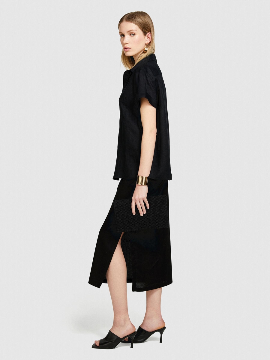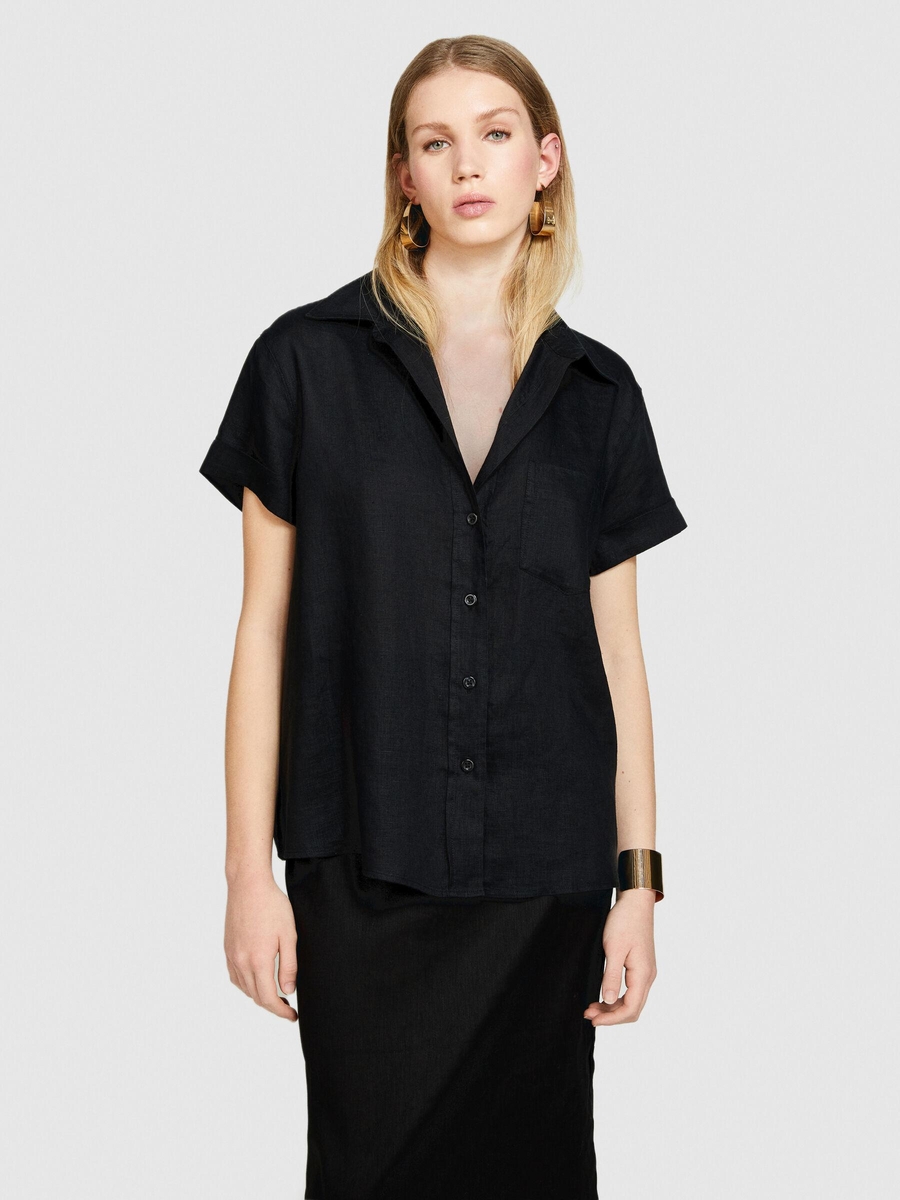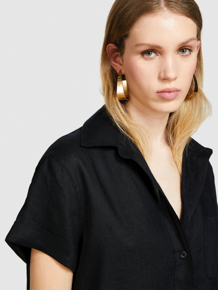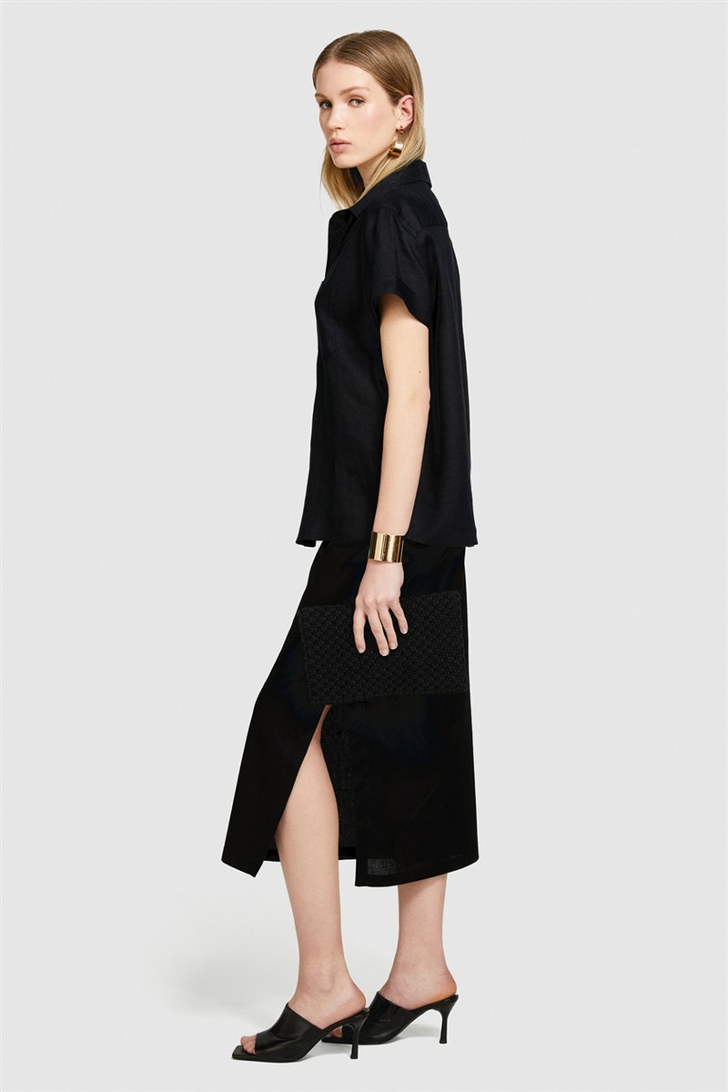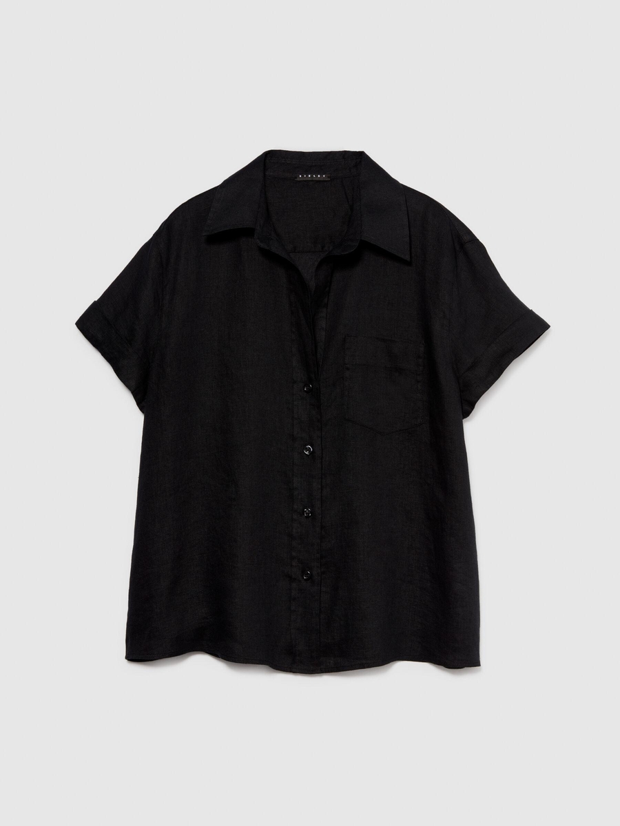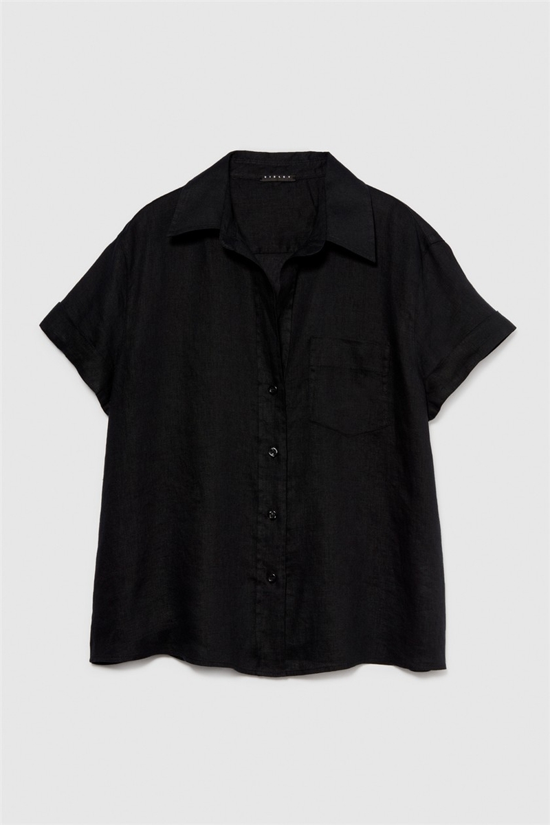 %100 Keten Düğmeli Göğüs Cepli Kısa Kollu Gömlek Kadın Siyah Gömlek - 324P5BMLLQ042