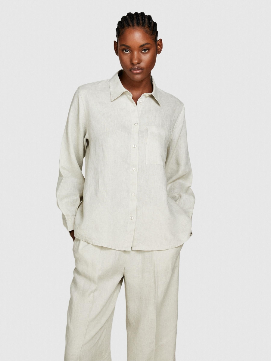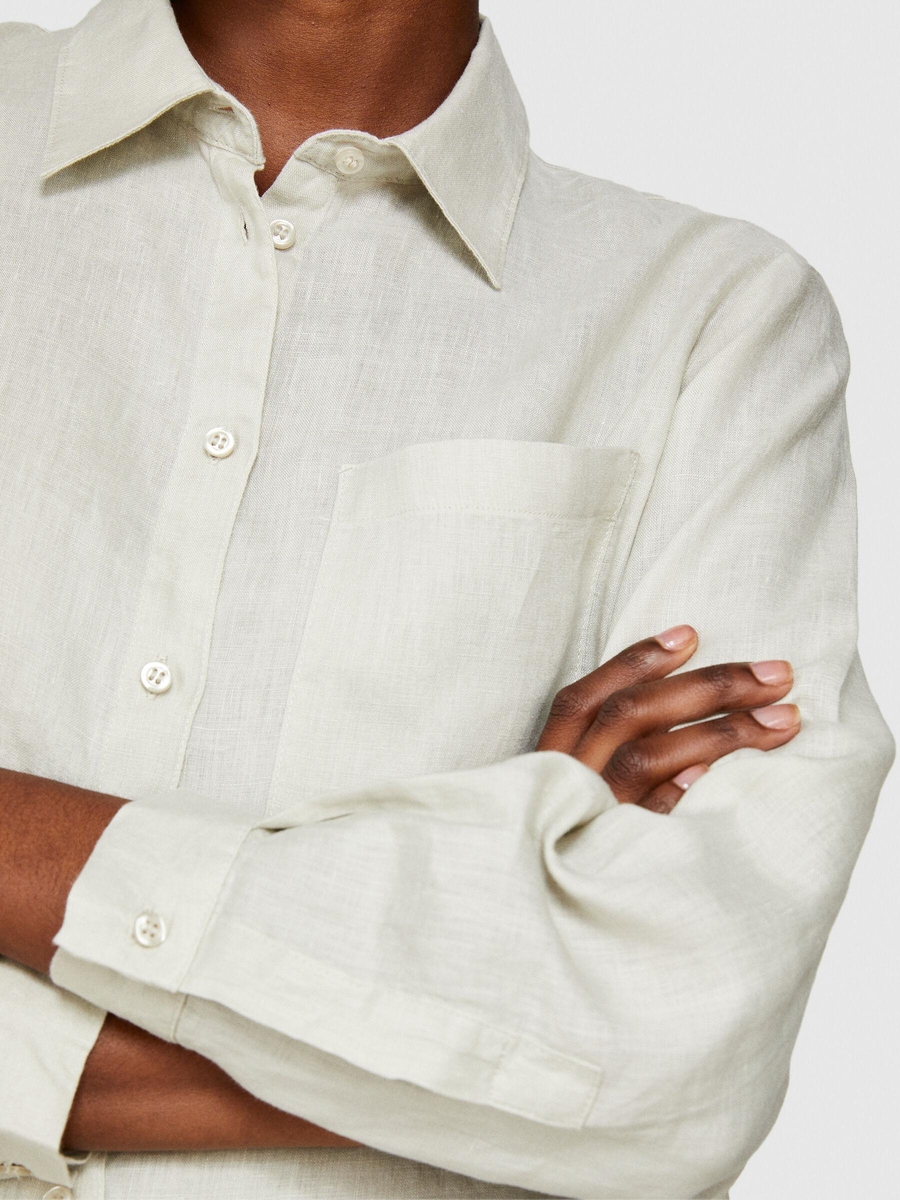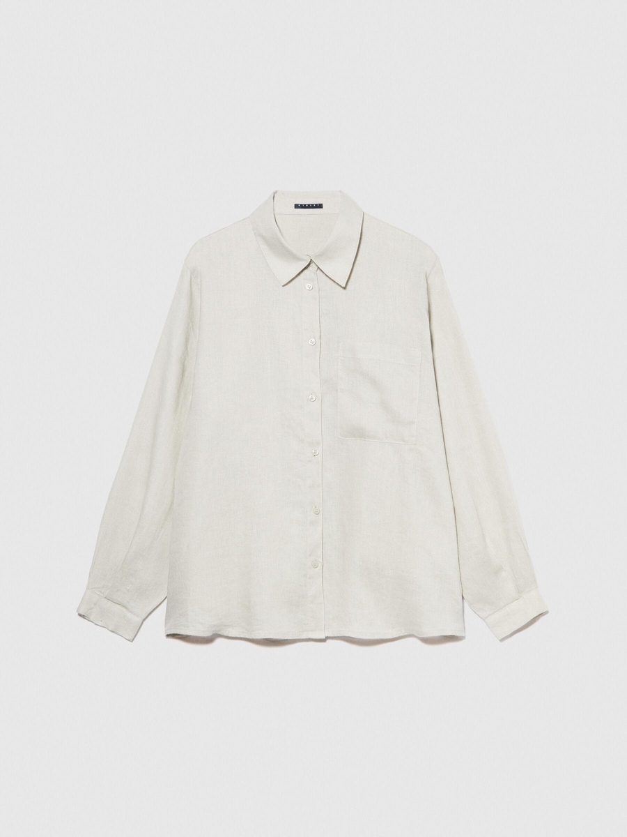 %100 Keten Düğmeli Göğüs Cepli Uzun Kollu Gömlek Kadın Bej Gömlek - 324P5BMLLQ06S