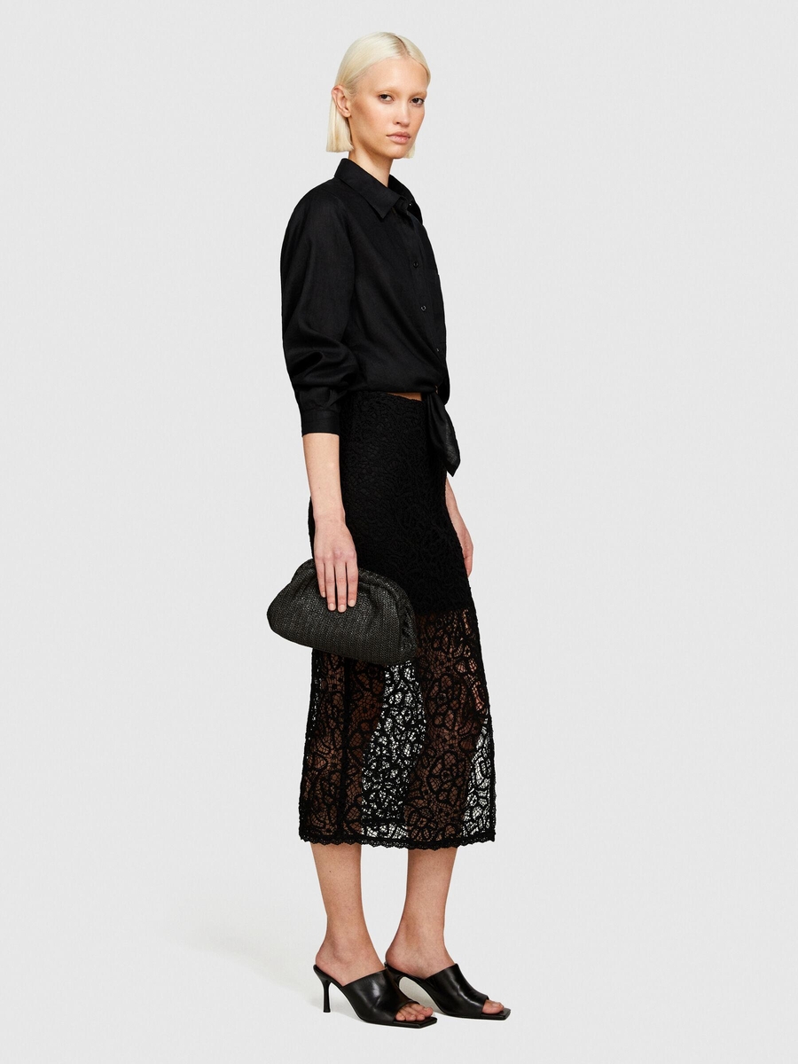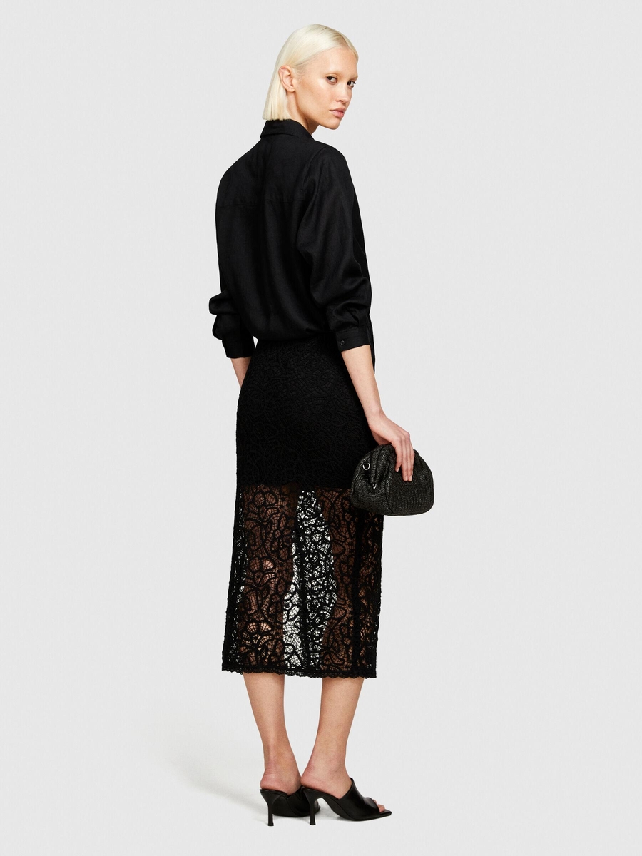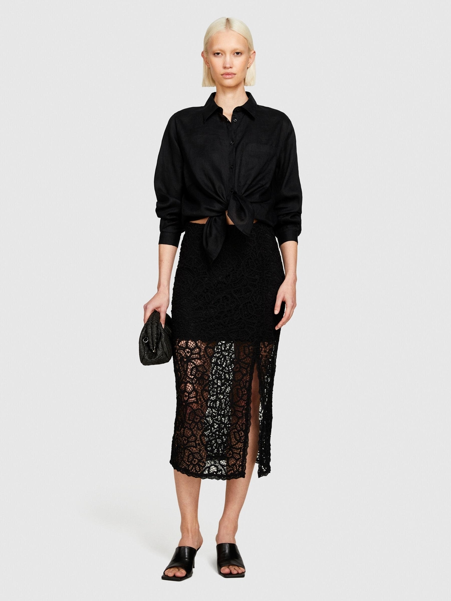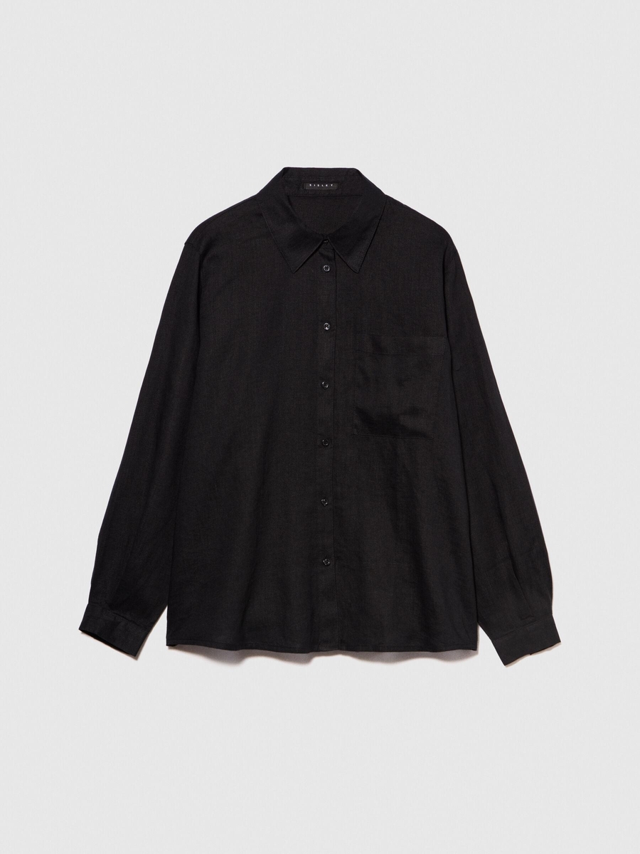 %100 Keten Düğmeli Göğüs Cepli Uzun Kollu Gömlek Kadın Siyah Gömlek - 324P5BMLLQ06S