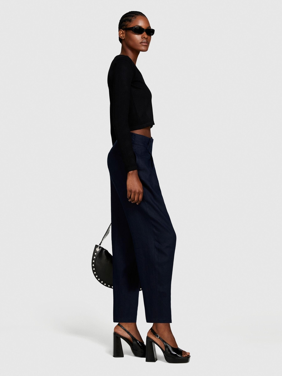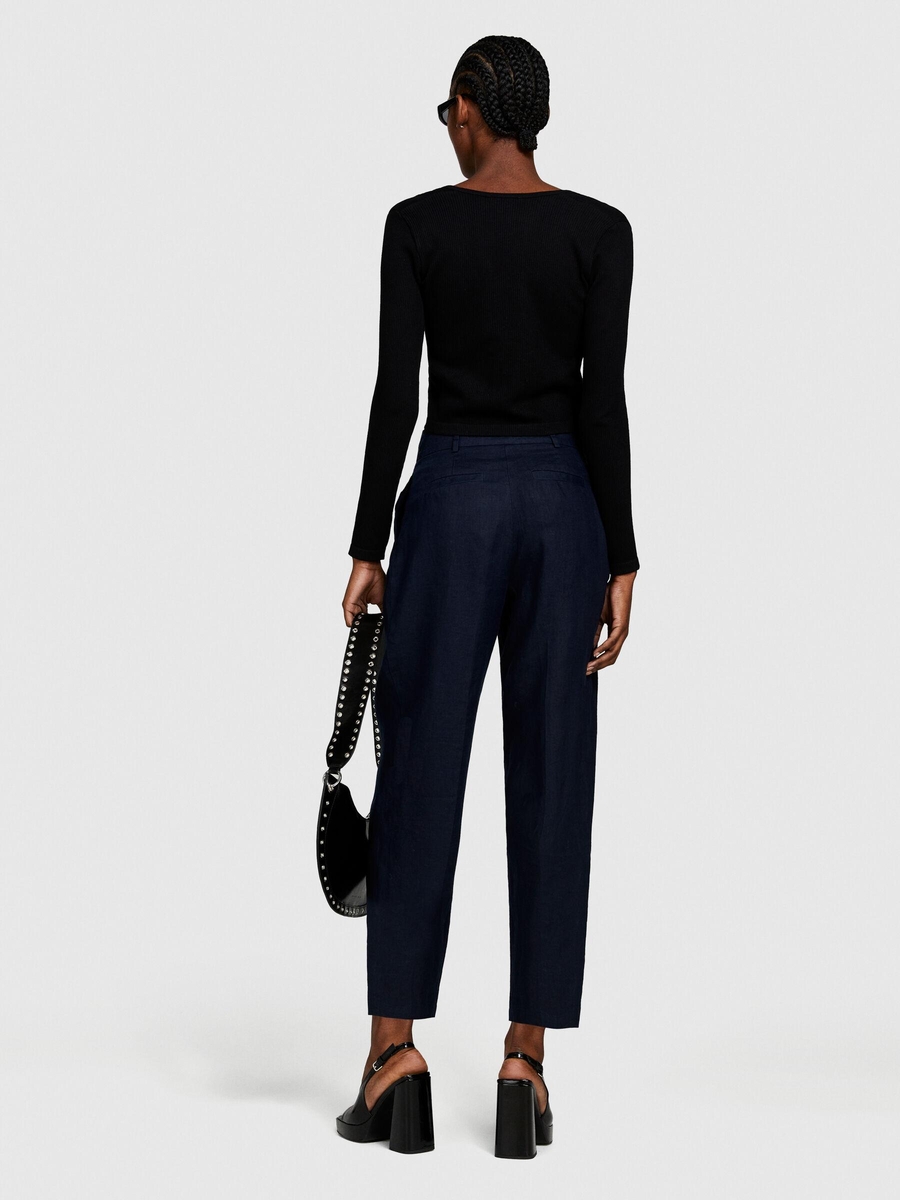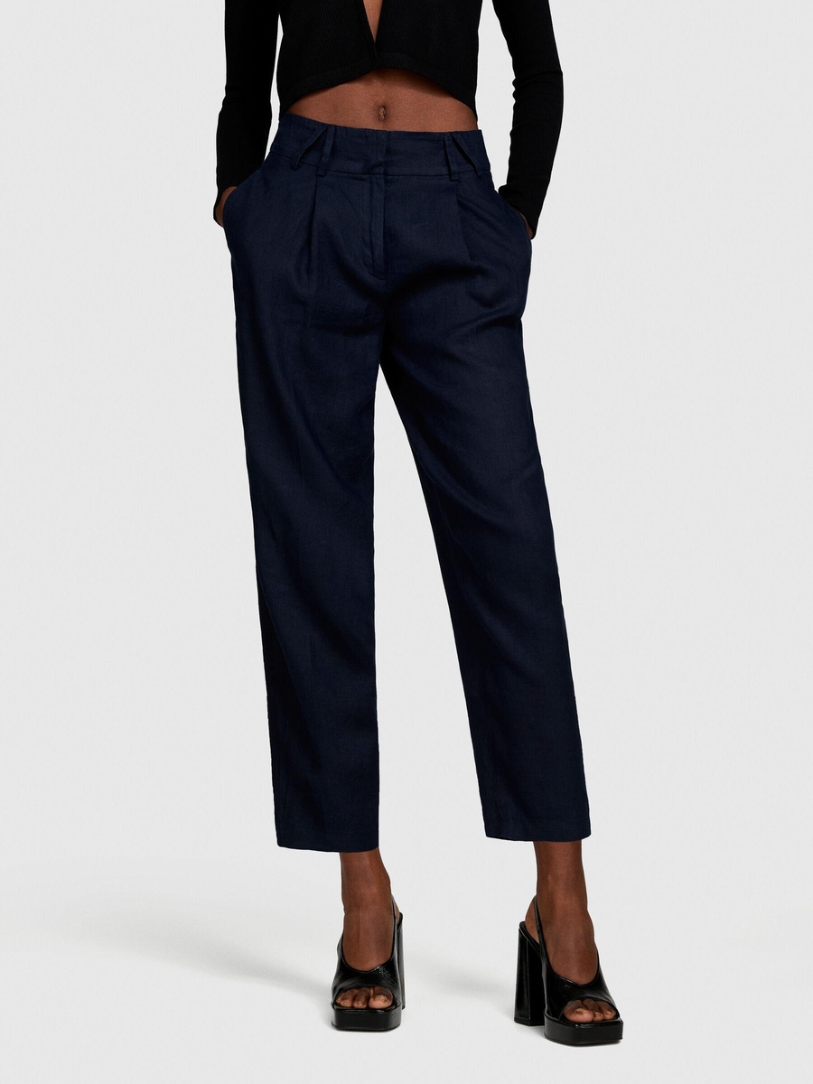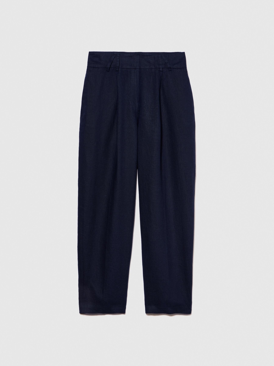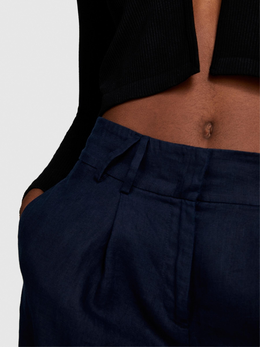%100 Keten Gizli Düğmeli Yüksek Bel Pantolon Kadın Lacivert Pantolon - 324P4AGHLF04Y