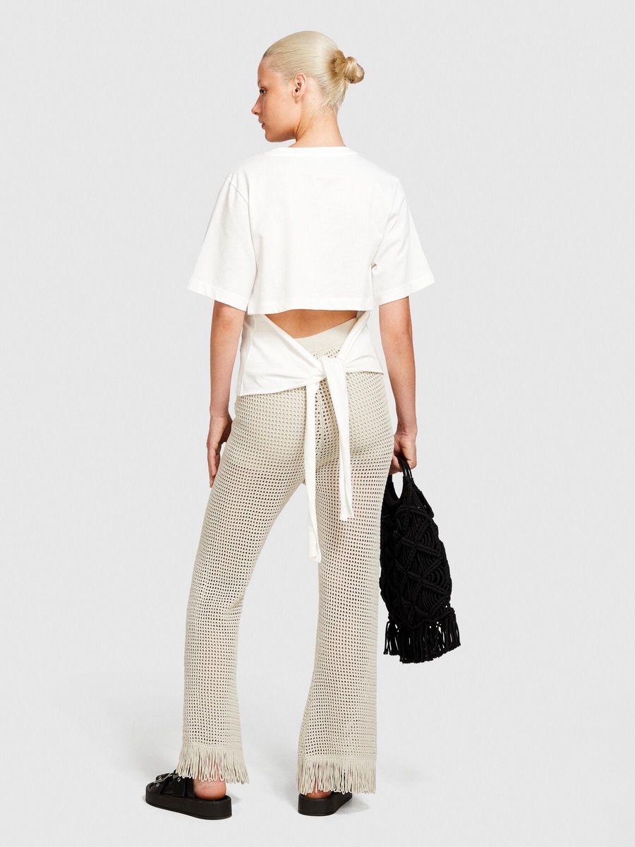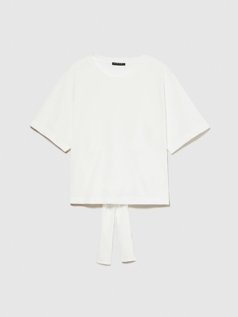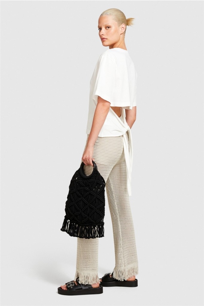 %100 Pamuk Arkası Bağlanabilir İpli Bisiklet Yaka T-Shirt Kadın Kırık Beyaz T-Shirt - 324P3B4BL105G