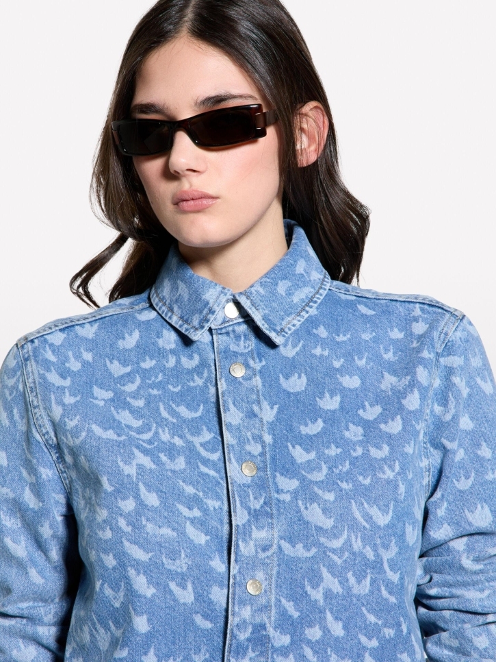 %100 Pamuk Desenli Çıtçıtlı Relax Fit Denim Gömlek Kadın Buz mavisi Denim Gömlek - 325P53Y3LQ08I