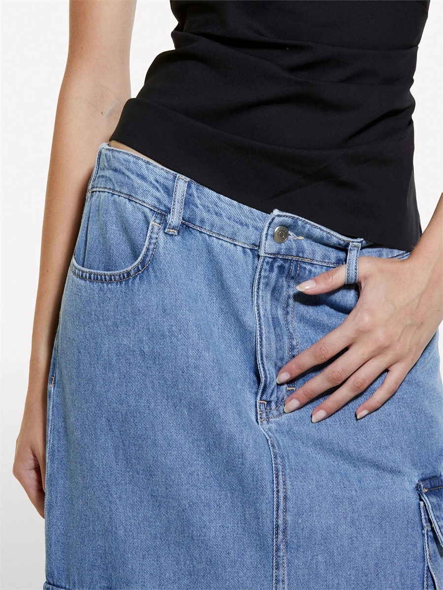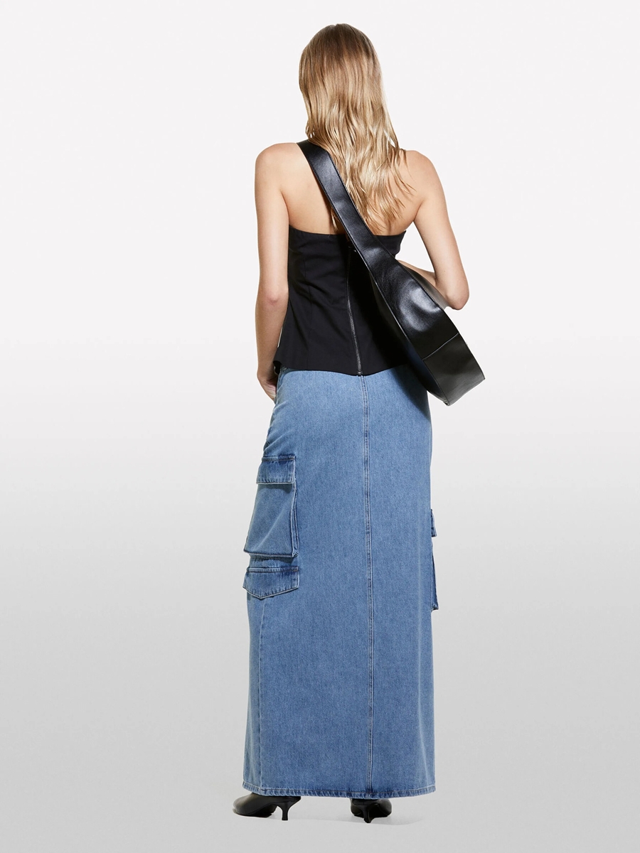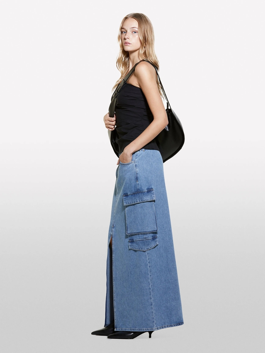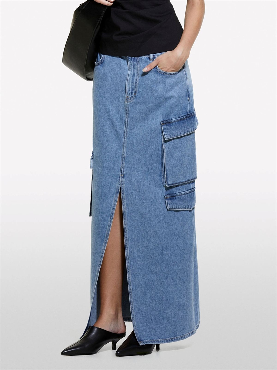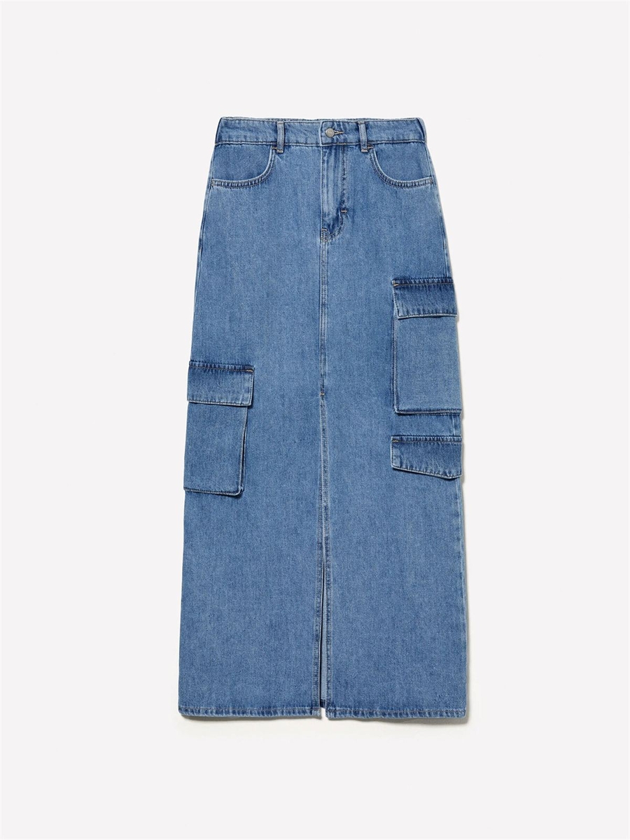 %100 Pamuk Önü Yırtmaçlı Cep Detaylı Uzun Etek Kadın Siyah Mix Etek - 324A4AGWL0025