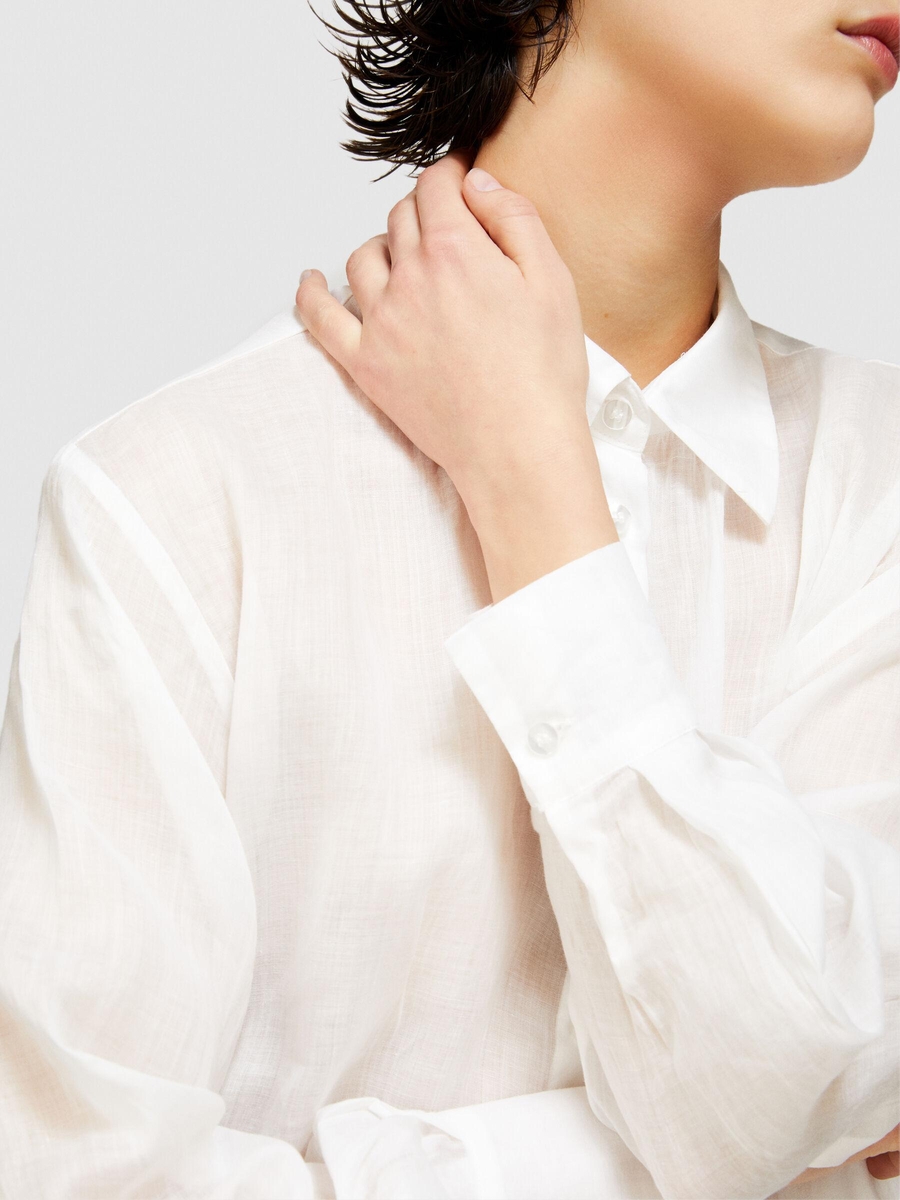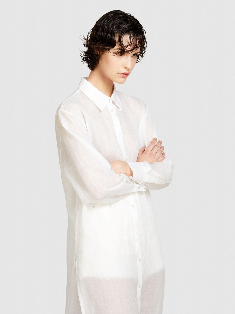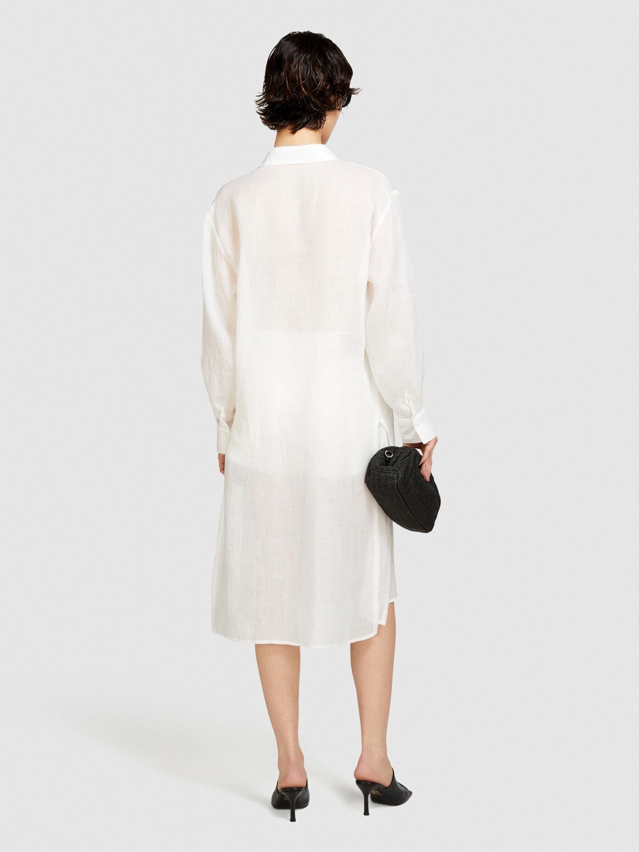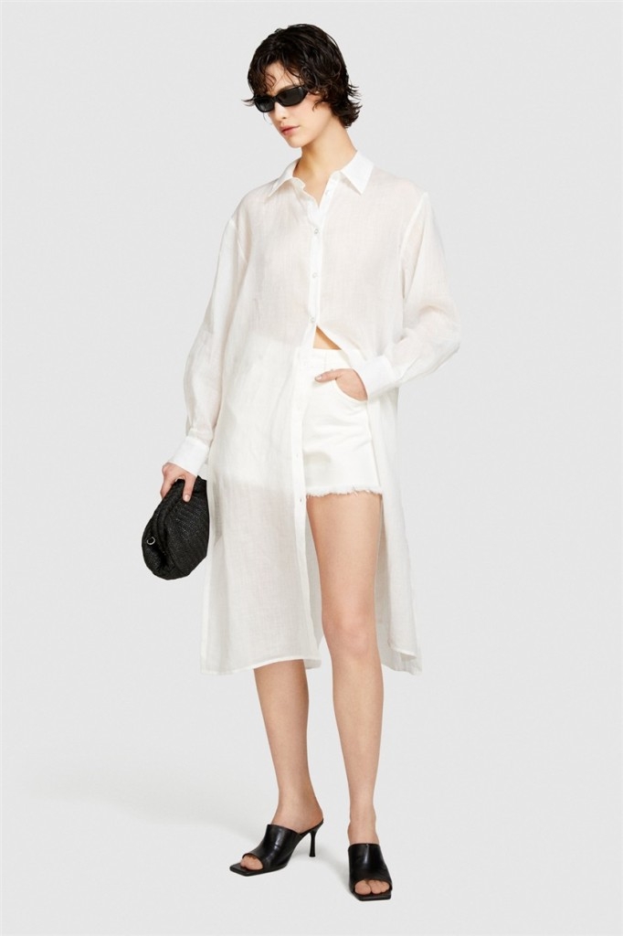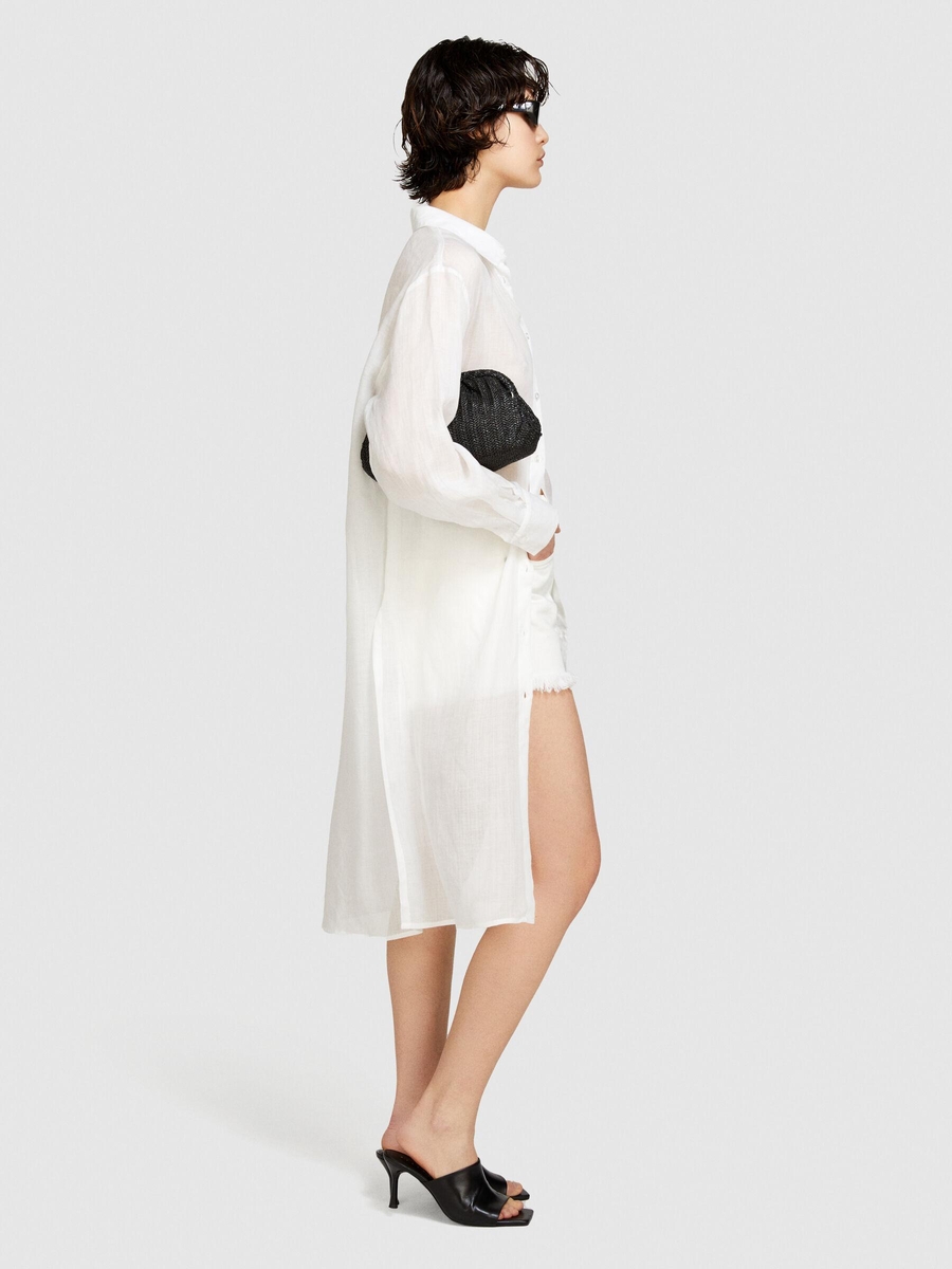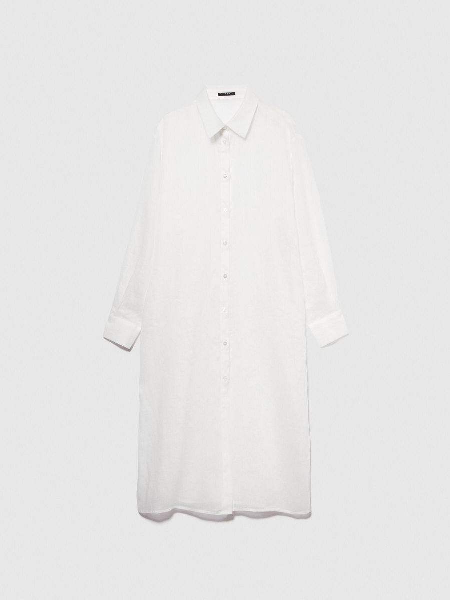 %100 Rami Önü Düğmeli Yanları Yüksek Yırtmaçlı Gömlek Kadın Kırık Beyaz Gömlek - 324P58IVLQ077