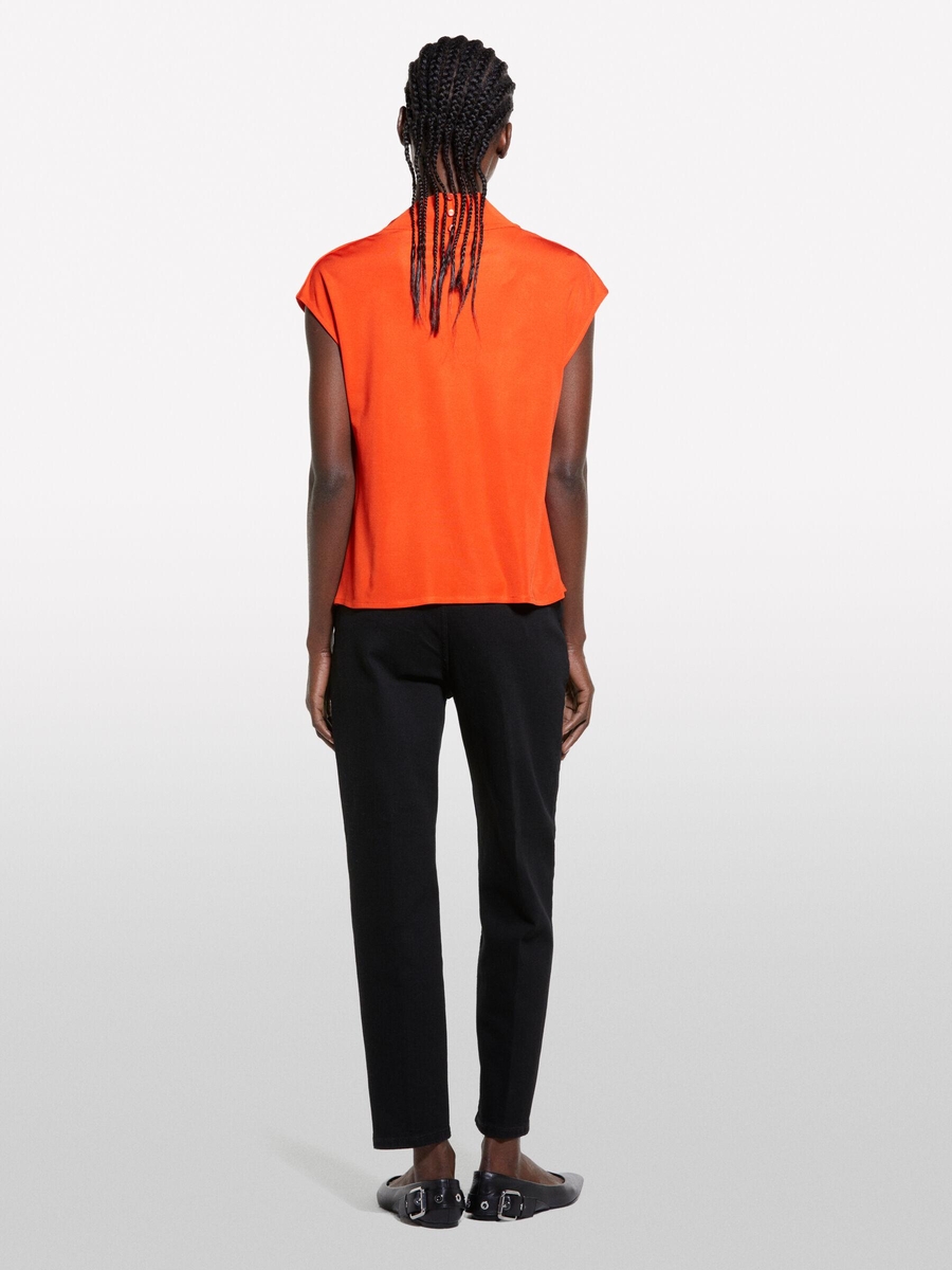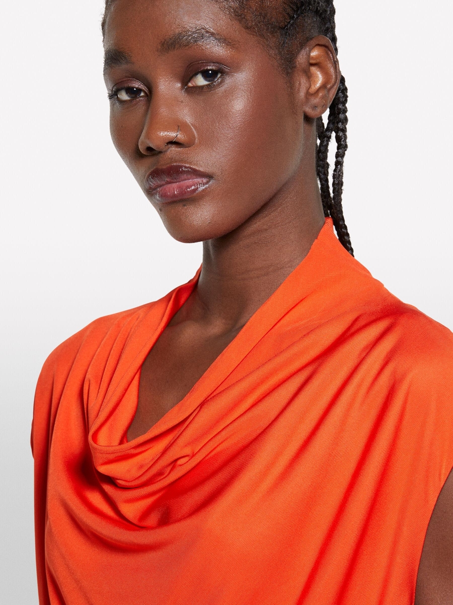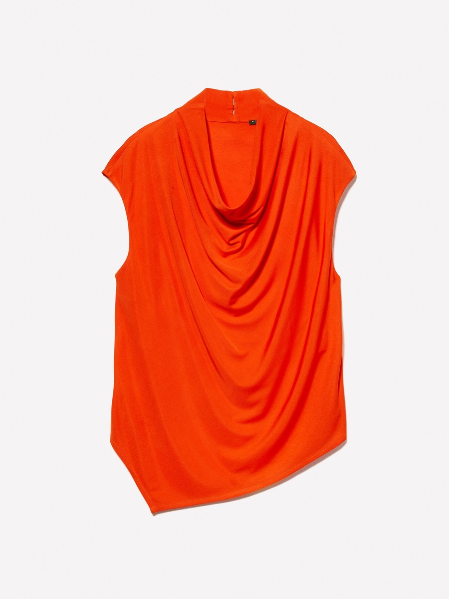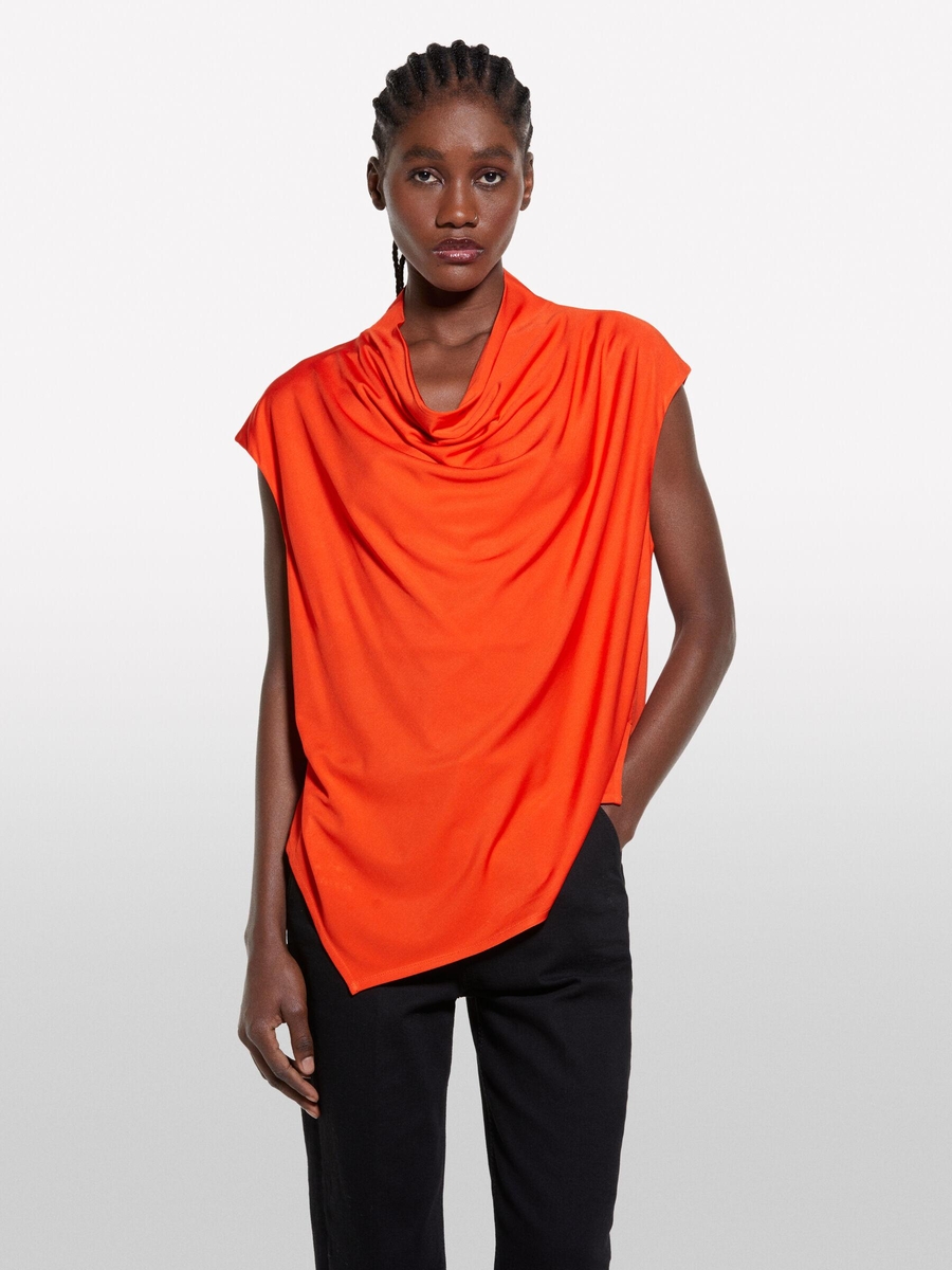 %100 Viskoz Asimetrik Dökümlü Yaka Kolsuz Üst Kadın Nar Çiçeği Bluz - 325P5FNTLQ08P