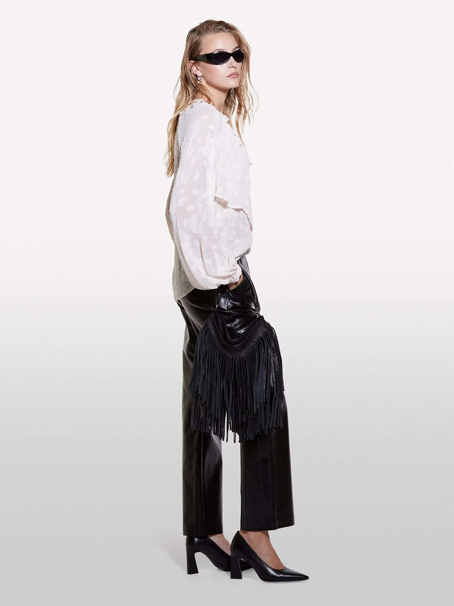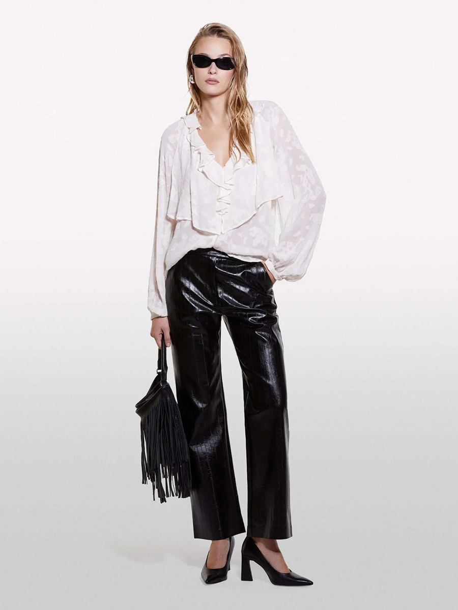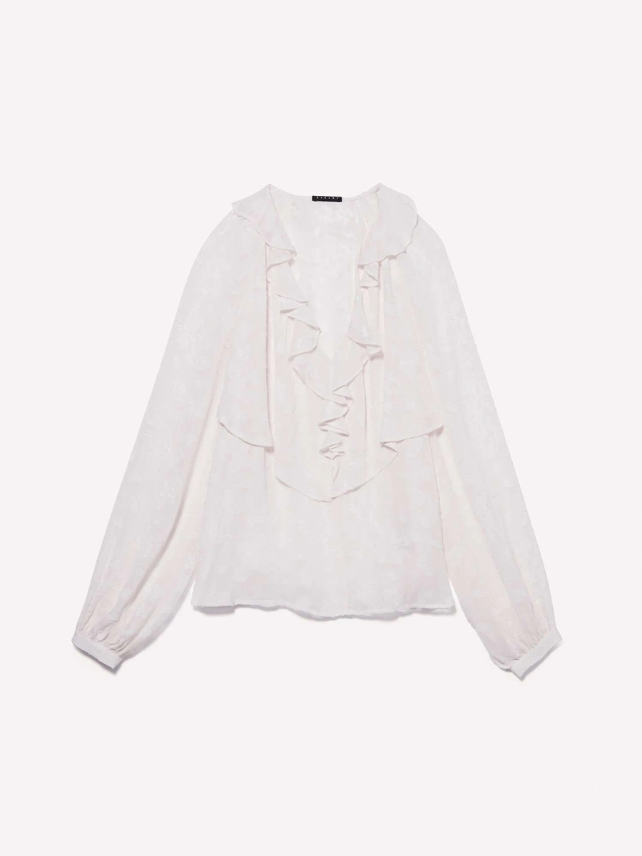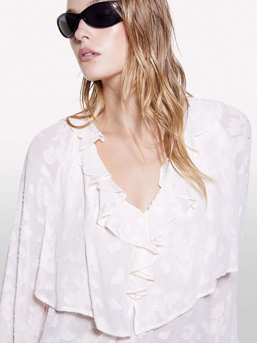 %100 Viskoz Fırfır Detaylı Rahat Kesim V Yaka Bluz Kadın Mavi Bluz - 324A5RL8LQ084