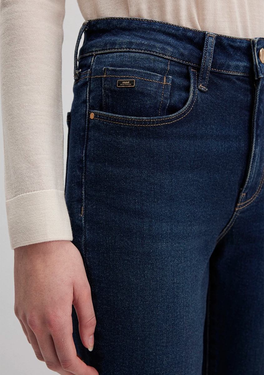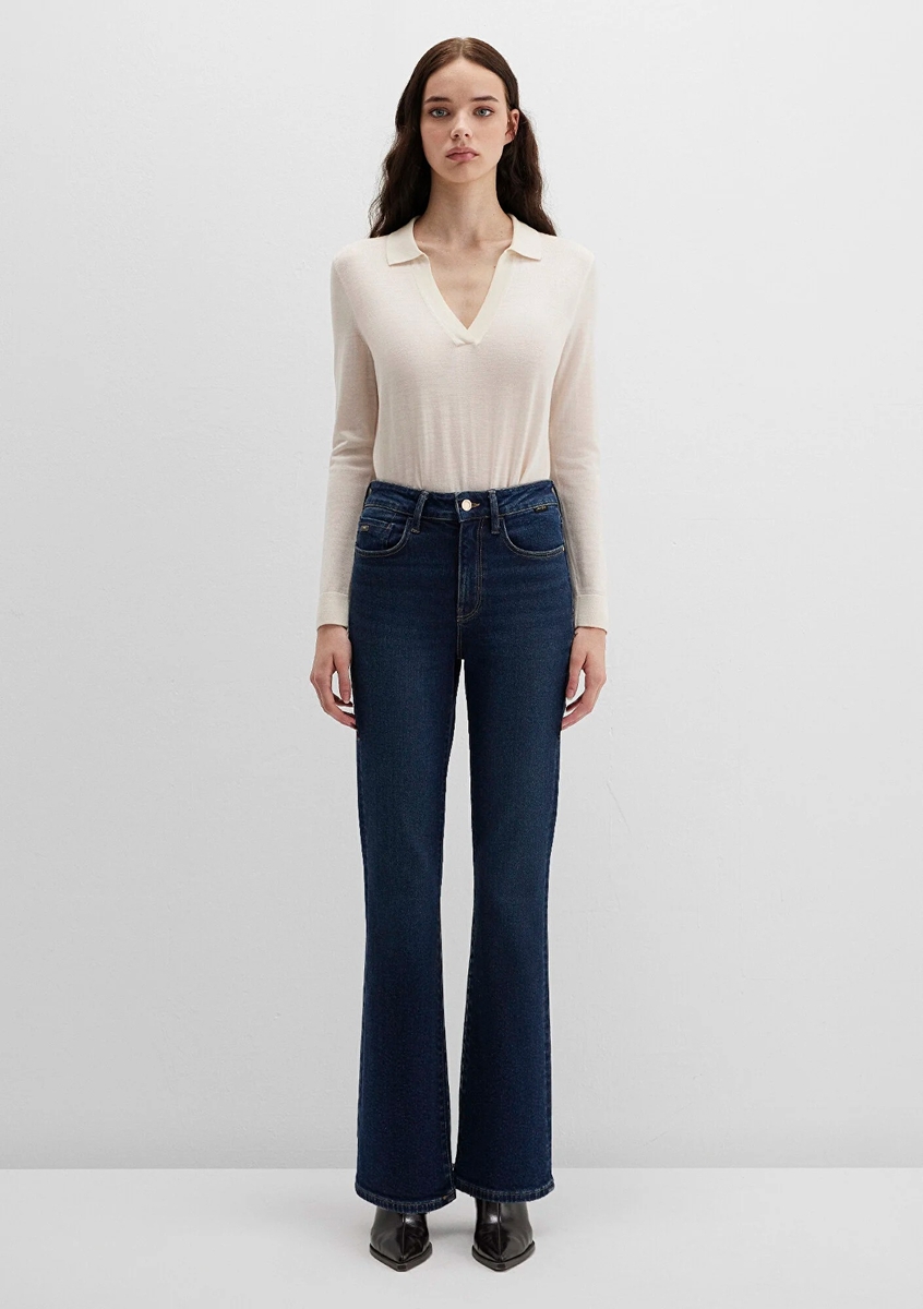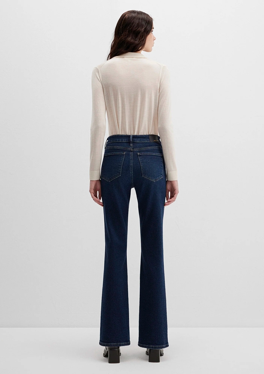 Bliss Gölgeli Jean Pantolon. Flare Jean. Yüksek bel. Dizden sonra açılan İspanyol paça. Denim modasını günlük giyimde yorumlayan Mavi'nin Şehirli Modern Jean'lerinden biri.
