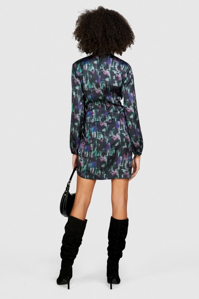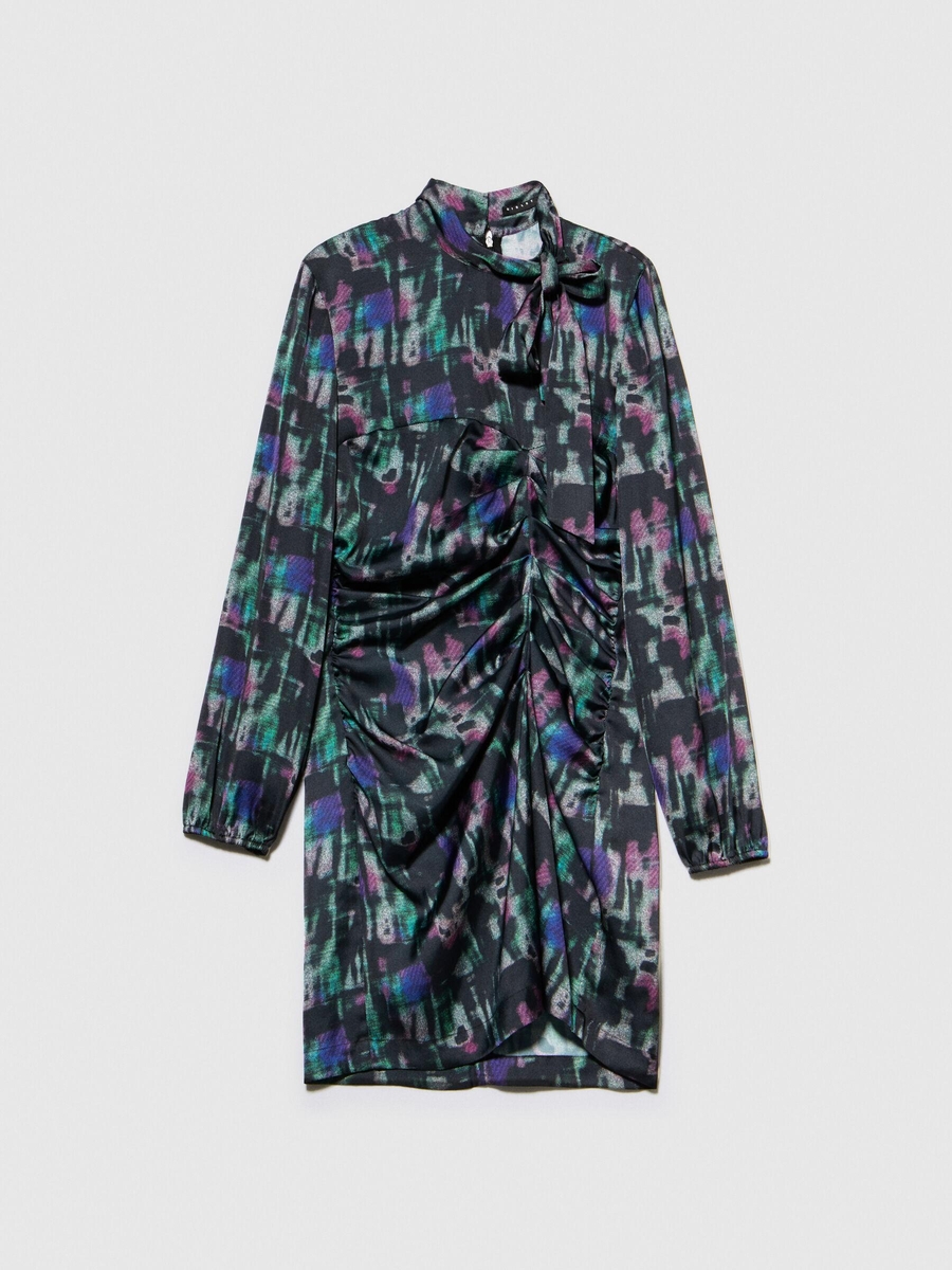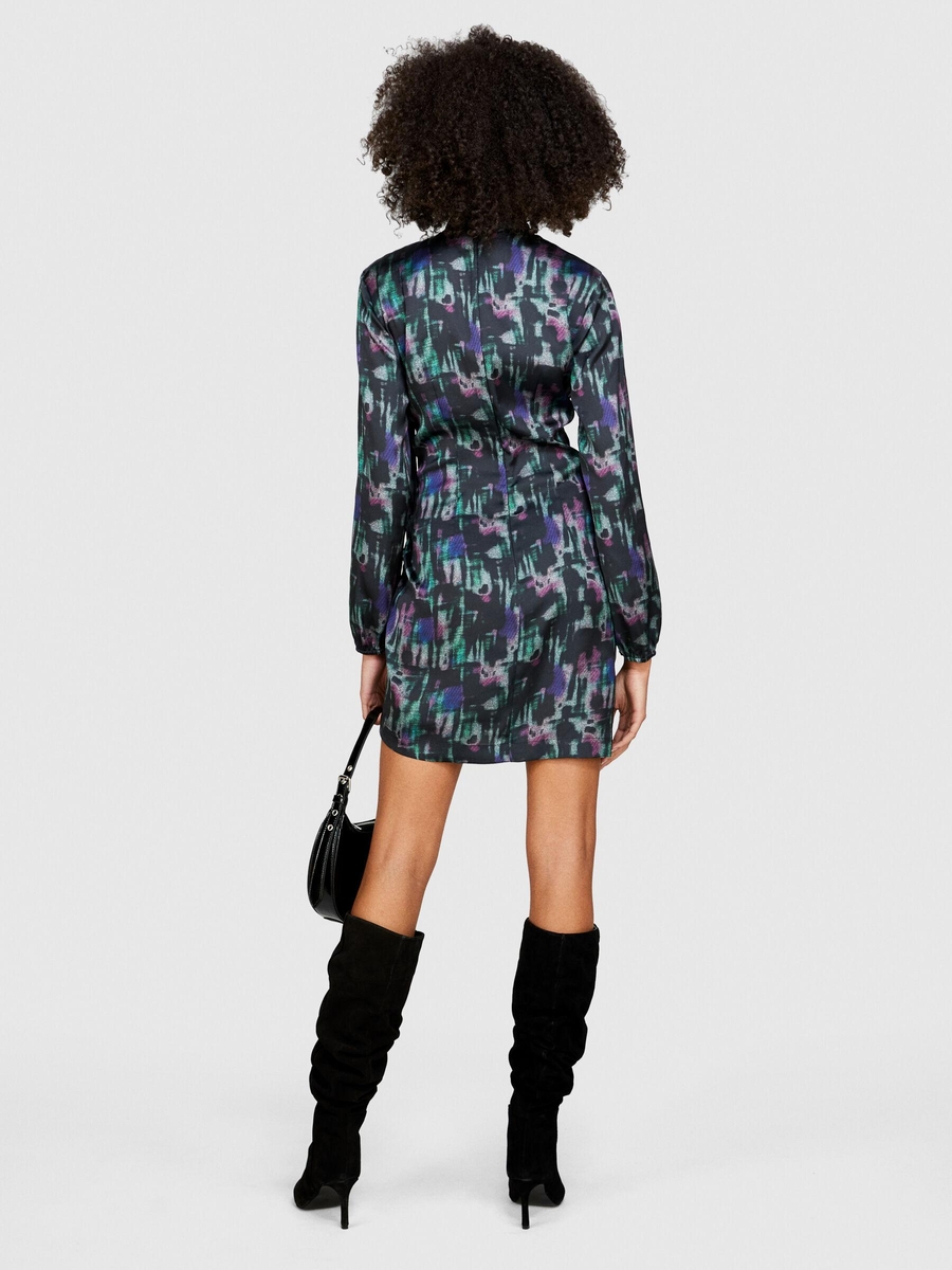 Desenli Önü Büzgülü Arkadan Düğmeli Uzun Kollu Elbise Kadın Mavi Elbise - 323A4RTMLV046