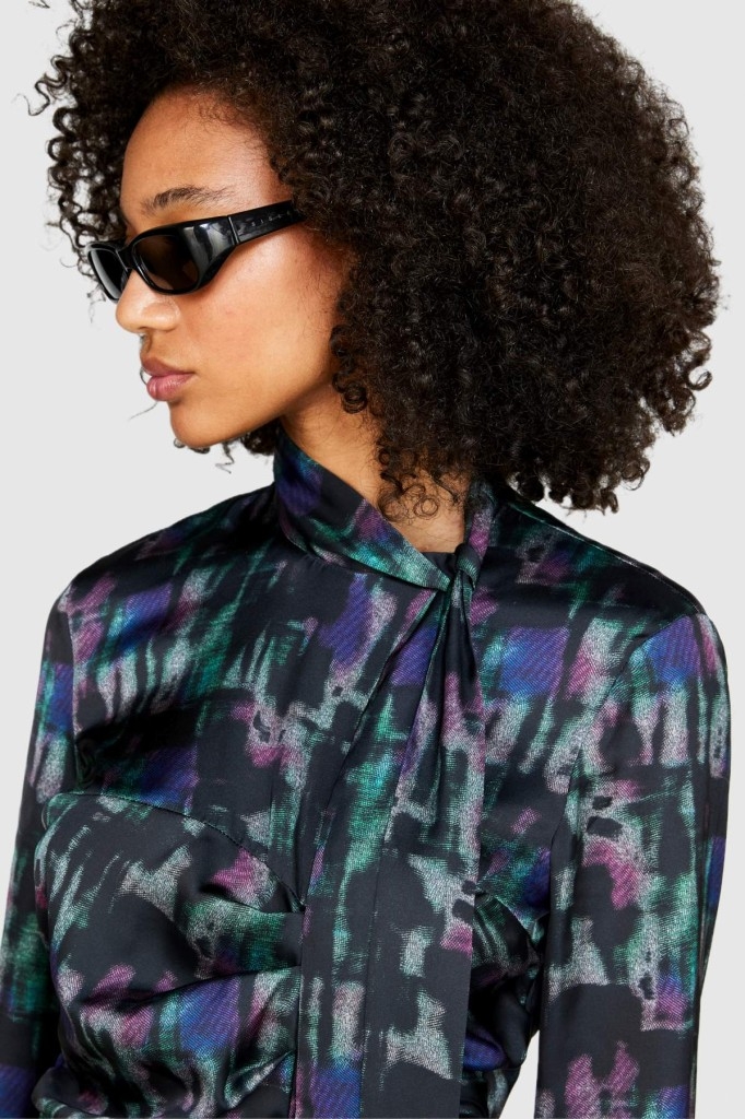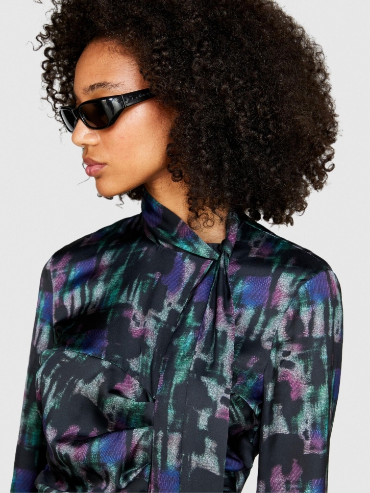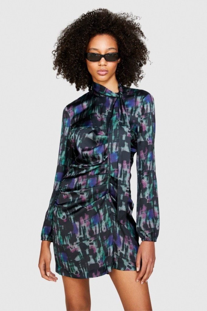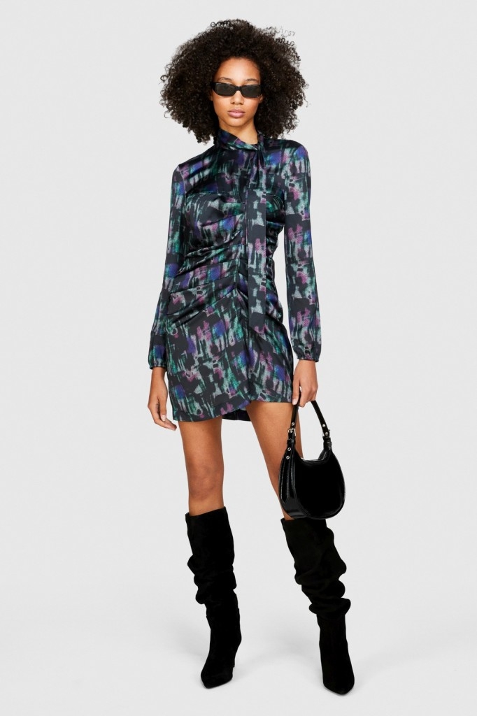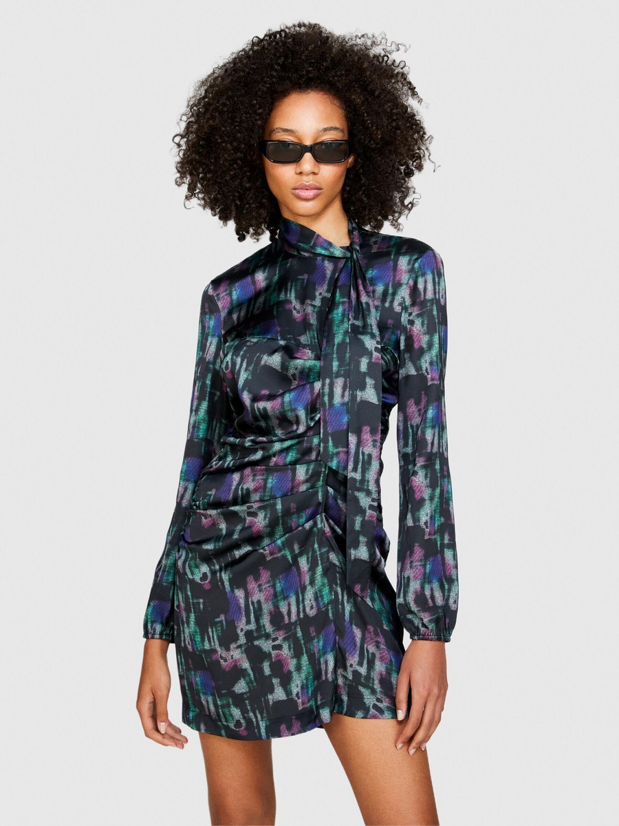Desenli Önü Büzgülü Arkadan Düğmeli Uzun Kollu Elbise Kadın Mavi Elbise - 323A4RTMLV046