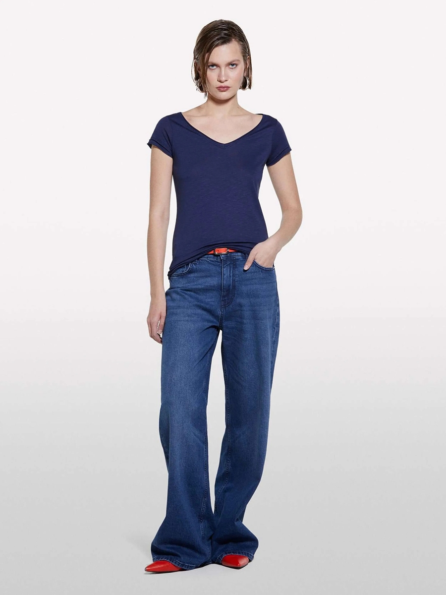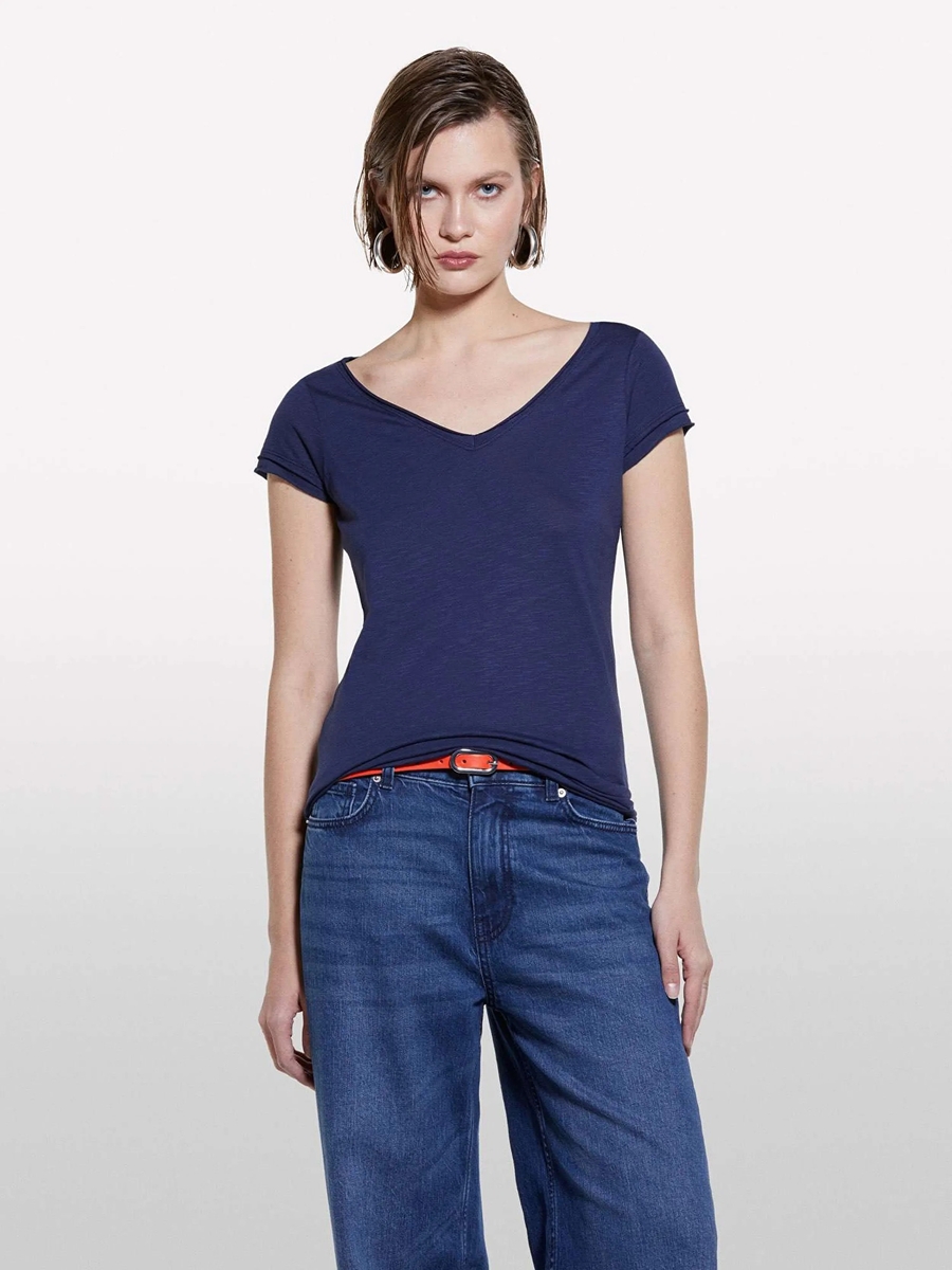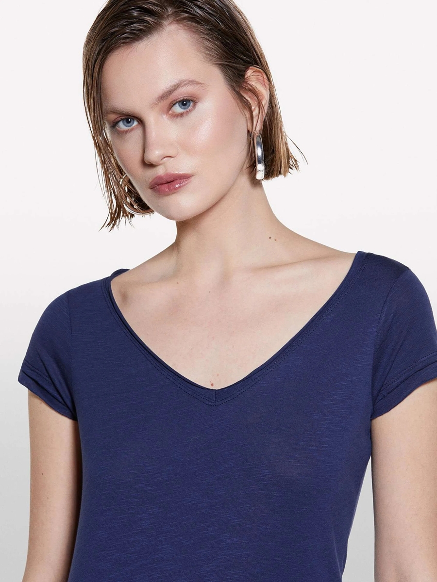 Pamuk Modal Karışımlı Normal Kalıp V Yaka Slub T-Shirt Kadın LACİVERT T-Shirt - 325P3TNHL4007