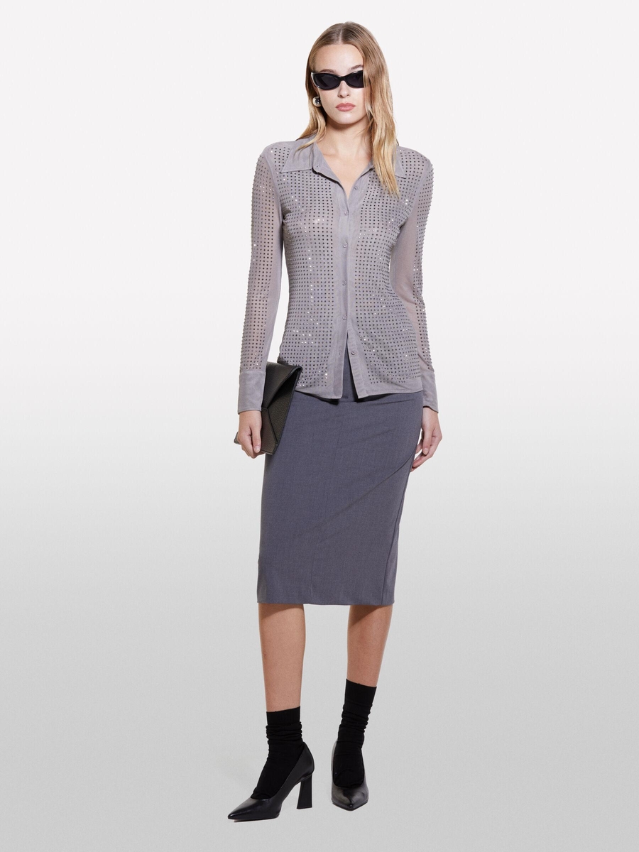 Parlak Taş Detaylı Dar Kesim Sivri Yaka Tül Gömlek Kadın Gri Gömlek - 324A5MNPLQ083