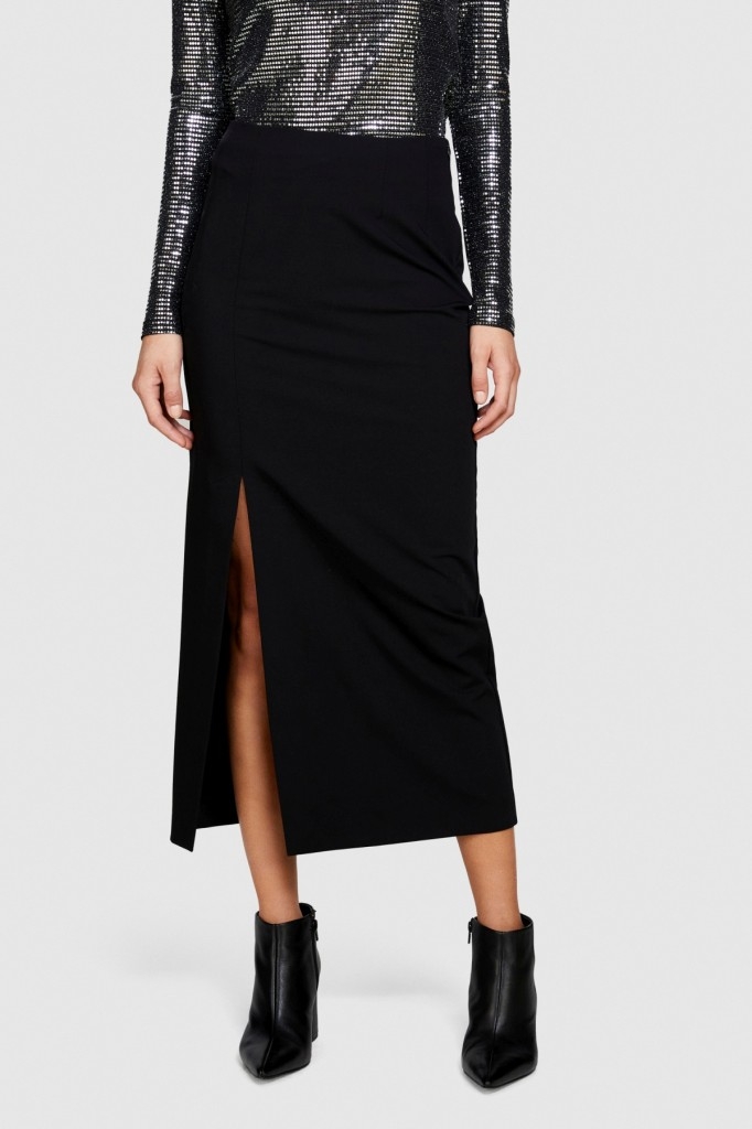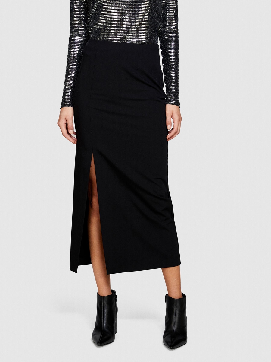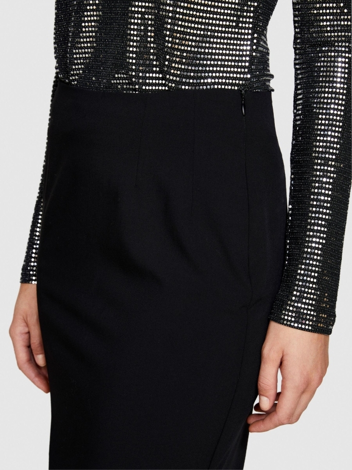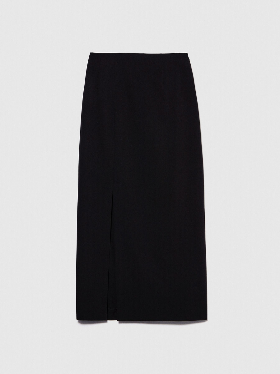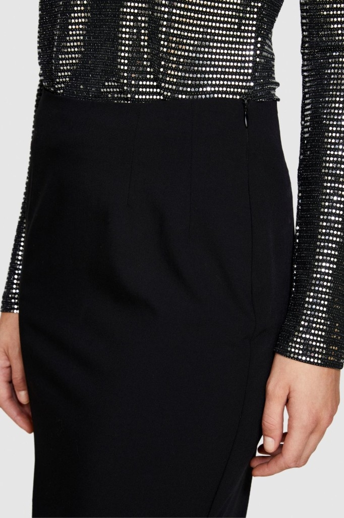 Poliviskoz Esnek Midi Boy Yandan Fermuarlı Etek Kadın Siyah T-Shirt - 323A47N8L001N
