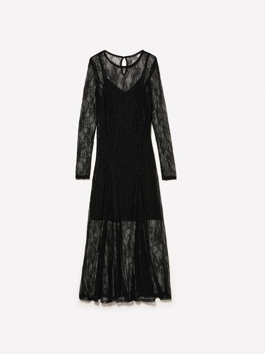 Tül Üzerine Dantel İşlemeli Yuvarlak Yaka Uzun Kollu Elbise Kadın Siyah Elbise - 324A4HLGLV06D