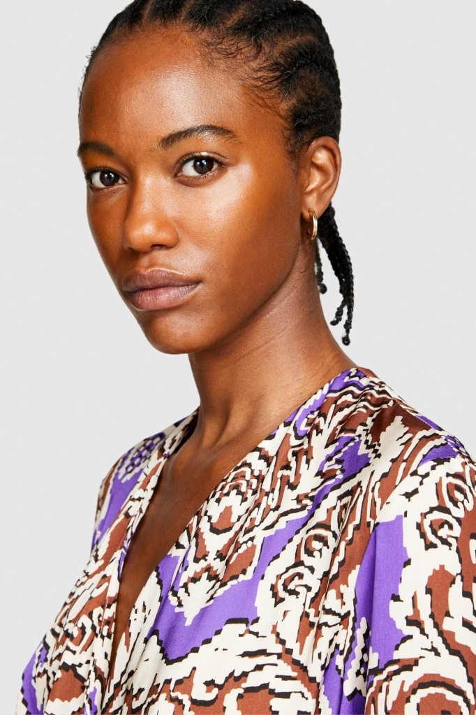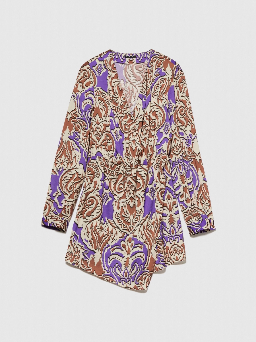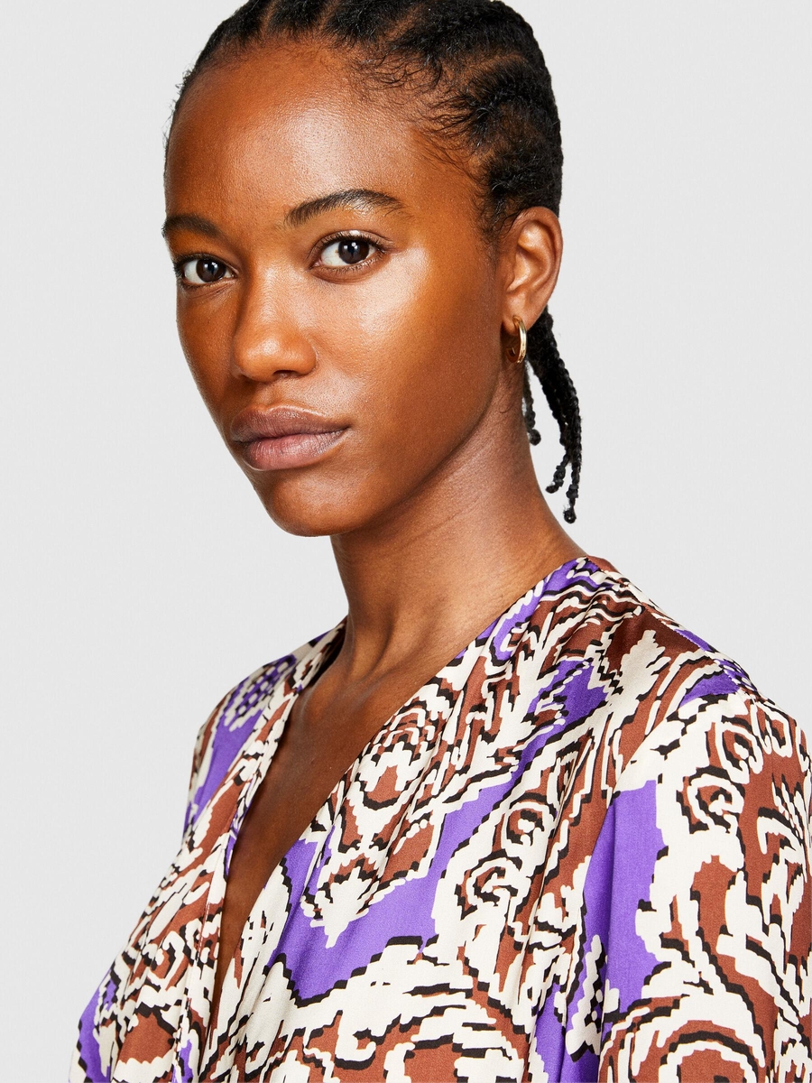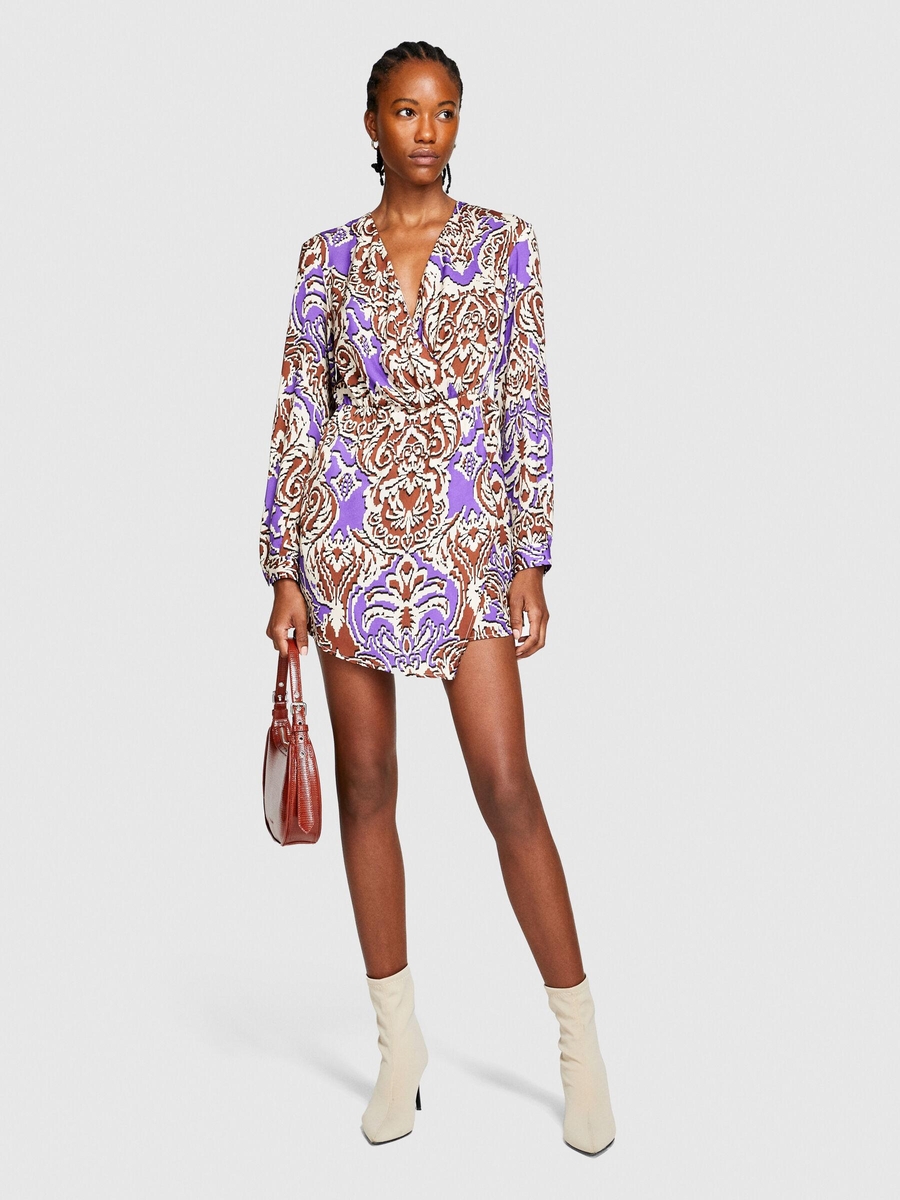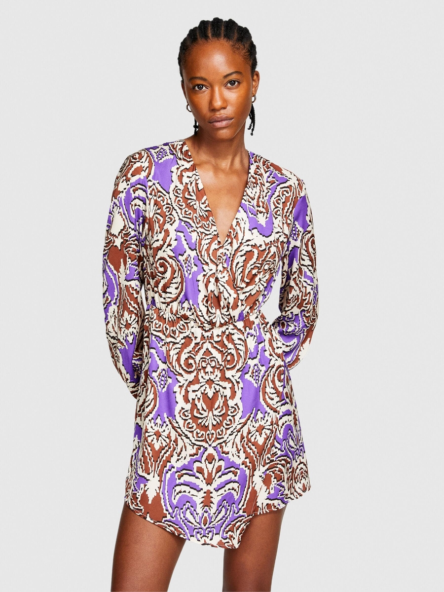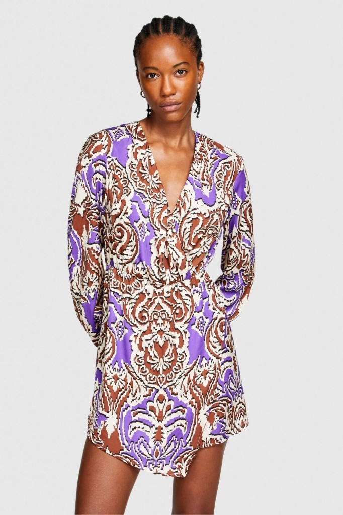 V Yaka Desenli Hafif Dökümlü Uzun Kollu Elbise Kadın Turuncu Elbise - 323A42WELV04I