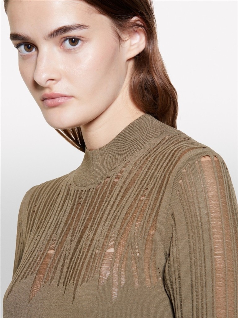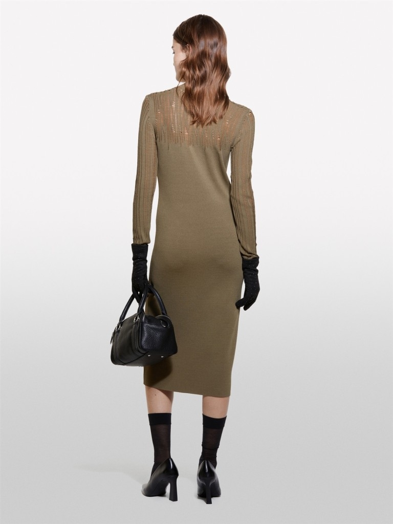 Viskoz Karışımlı Dar Kesim Uzun Kollu Düz Örgü Elbise Kadın Haki Elbise - 324A1MNPMV00S