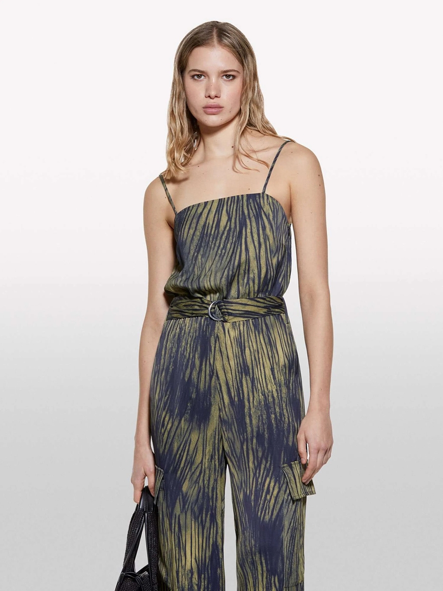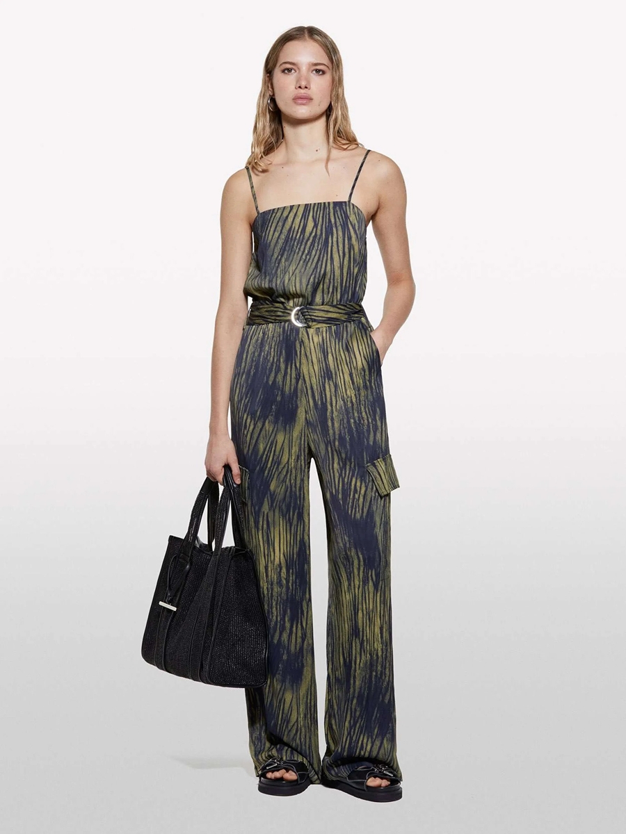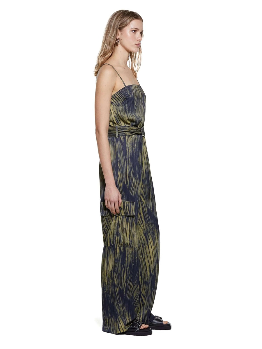 Viskoz Saten Desenli Beli Lastikli Askılı Tulum Kadın Yeşil Tulum - 325P48JCLT00O