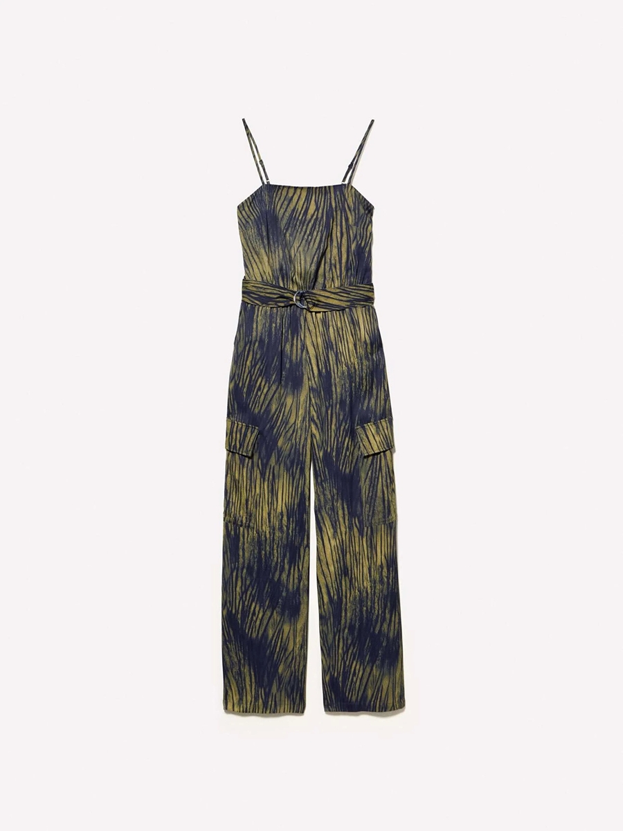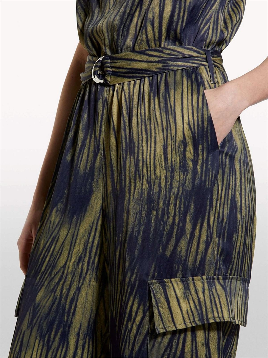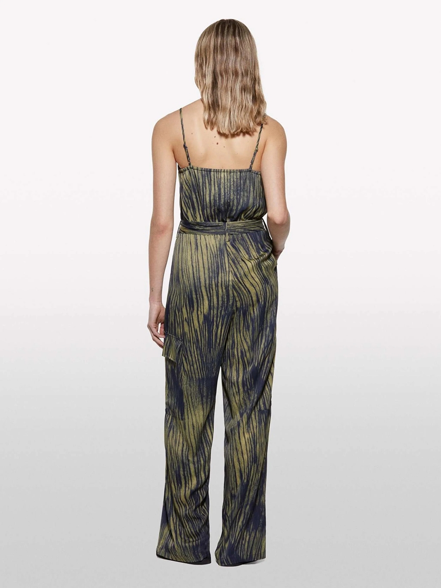 Viskoz Saten Desenli Beli Lastikli Askılı Tulum Kadın Yeşil Tulum - 325P48JCLT00O