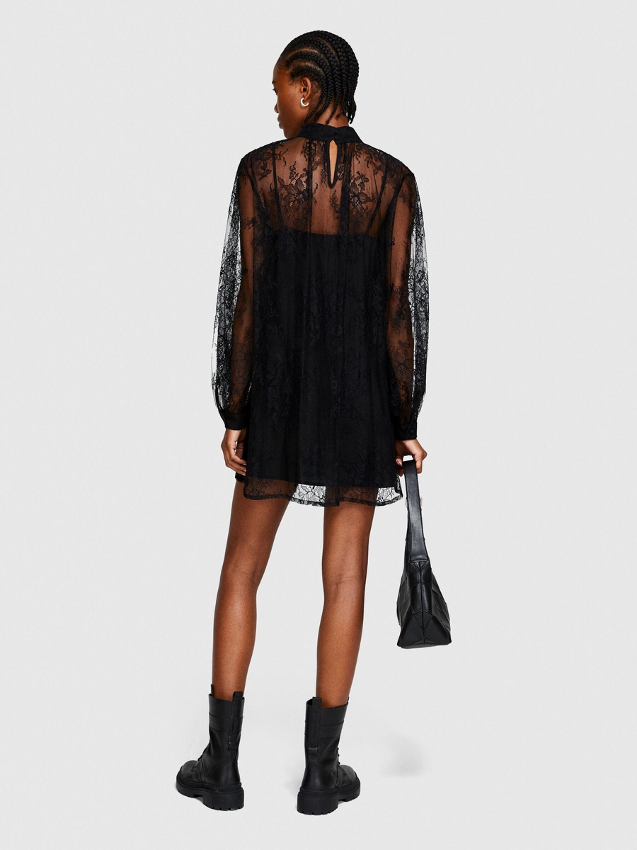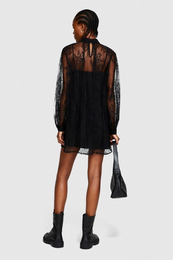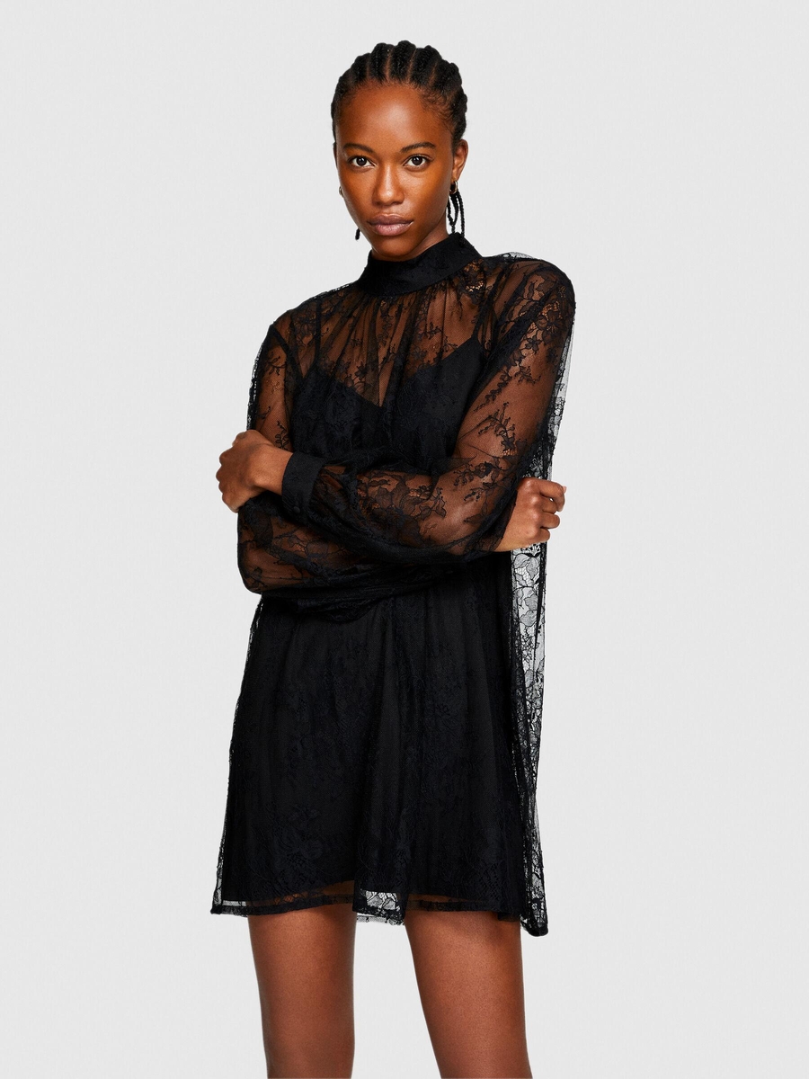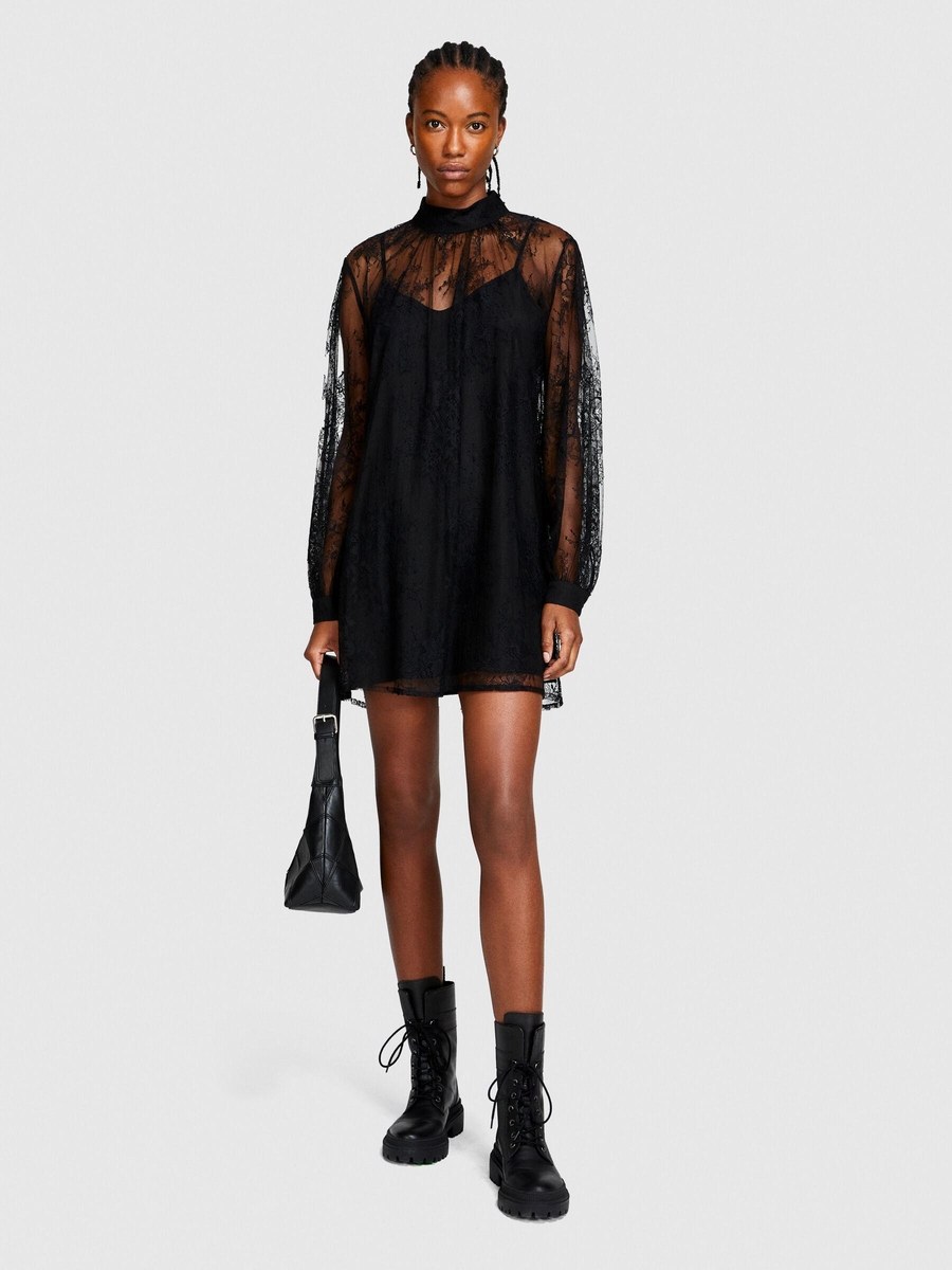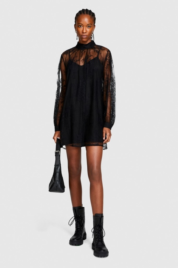 Yüksek Yakalı Uzun Kollu Dantel Elbise Kadın Siyah Elbise - 323A4FBYLV048